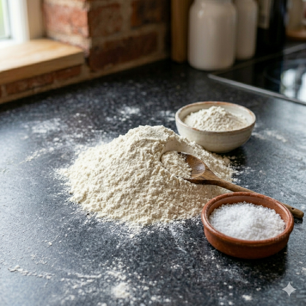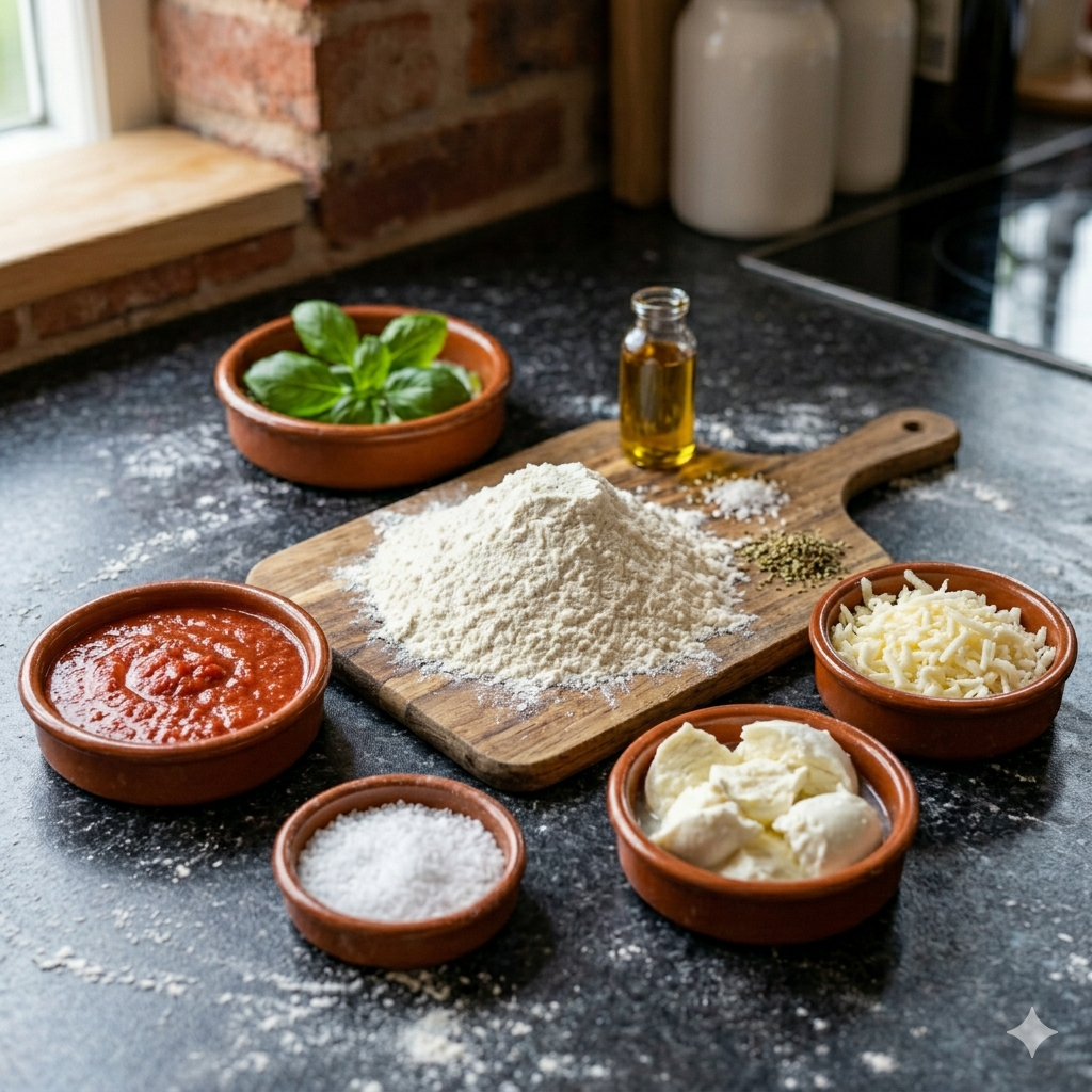 : 강력분 300g (이탈리아산 00 밀가루 권장), 미지근한 물 180ml, 드라이 이스트 4g, 소금 6g, 엑스트라 버진 올리브유 10ml, 설탕 5g