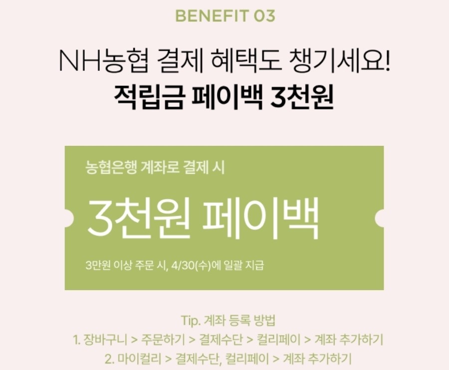 - 농협은행 계좌 결제 적립금 페이백(3,000원): 농협은행 계좌로 3만 원 이상 결제 시 적립
