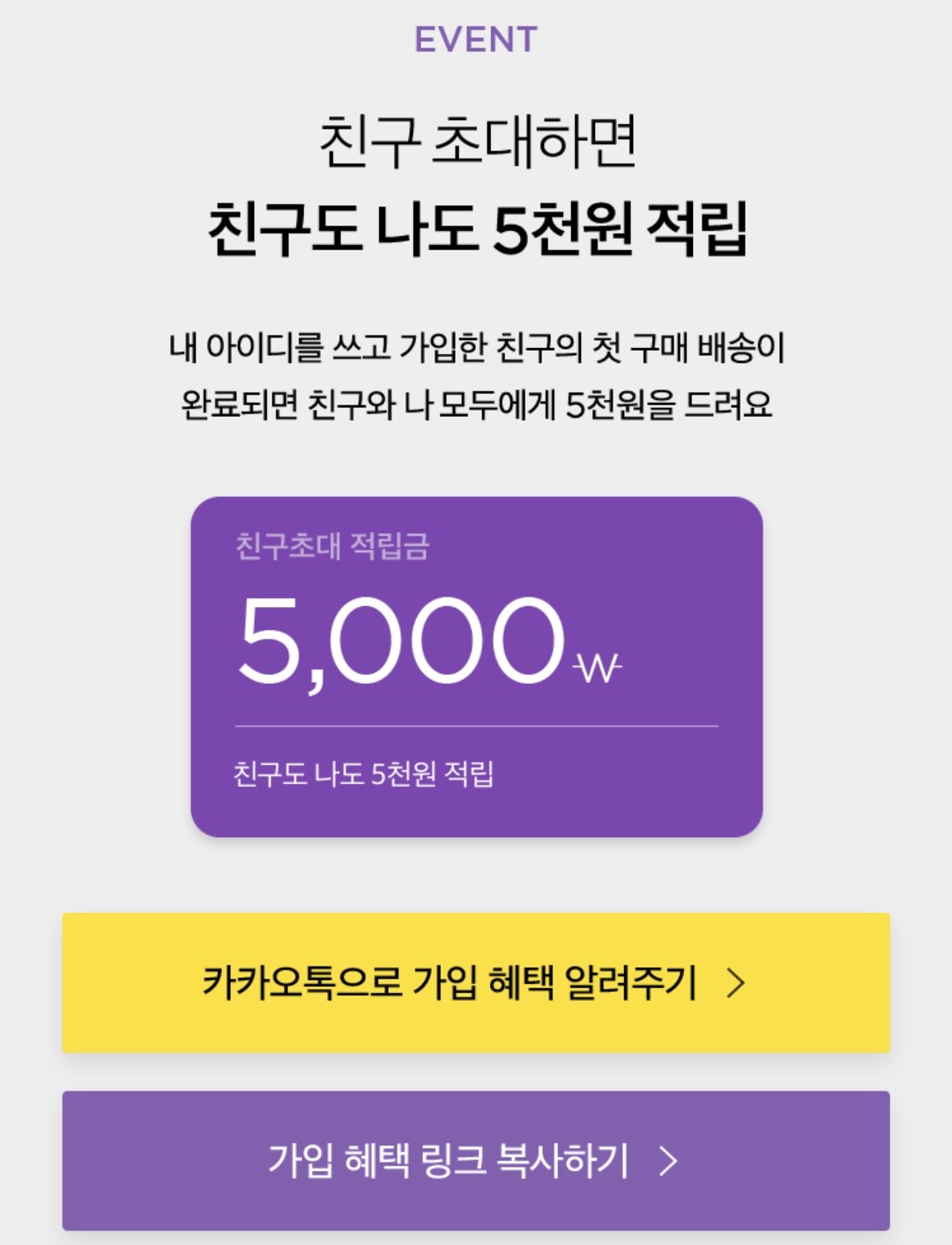 후 배송이 완료되면, 초대한 사람과 신규 가입자 모두에게 5천 원의 적립금이 지급됩니다.