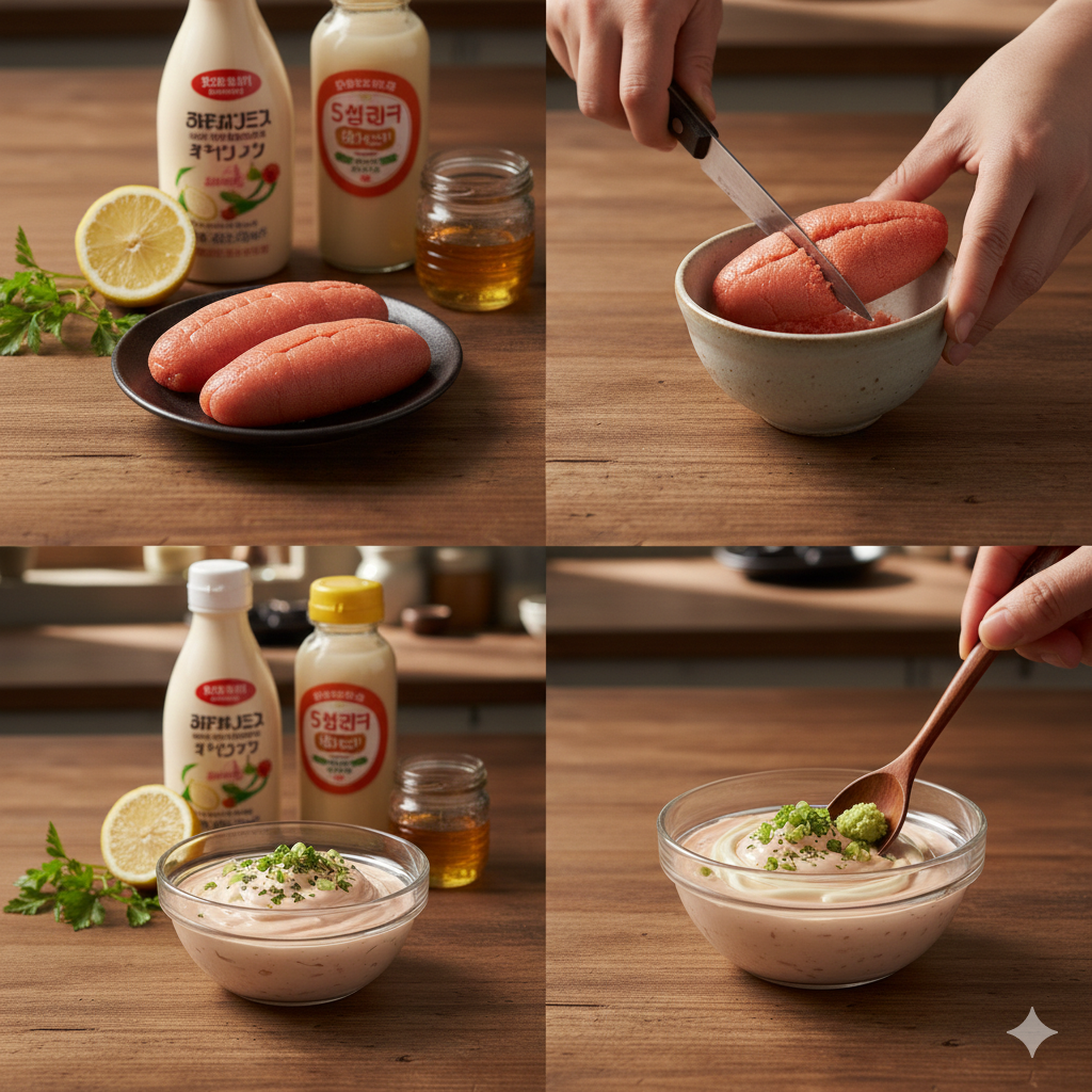 명란젓 특유의 감칠맛과 마요네즈의 고소함이 만나 탄생하는 이 소스는 덮밥, 바게트, 구이 등 활용도가 무궁무진합니다.
