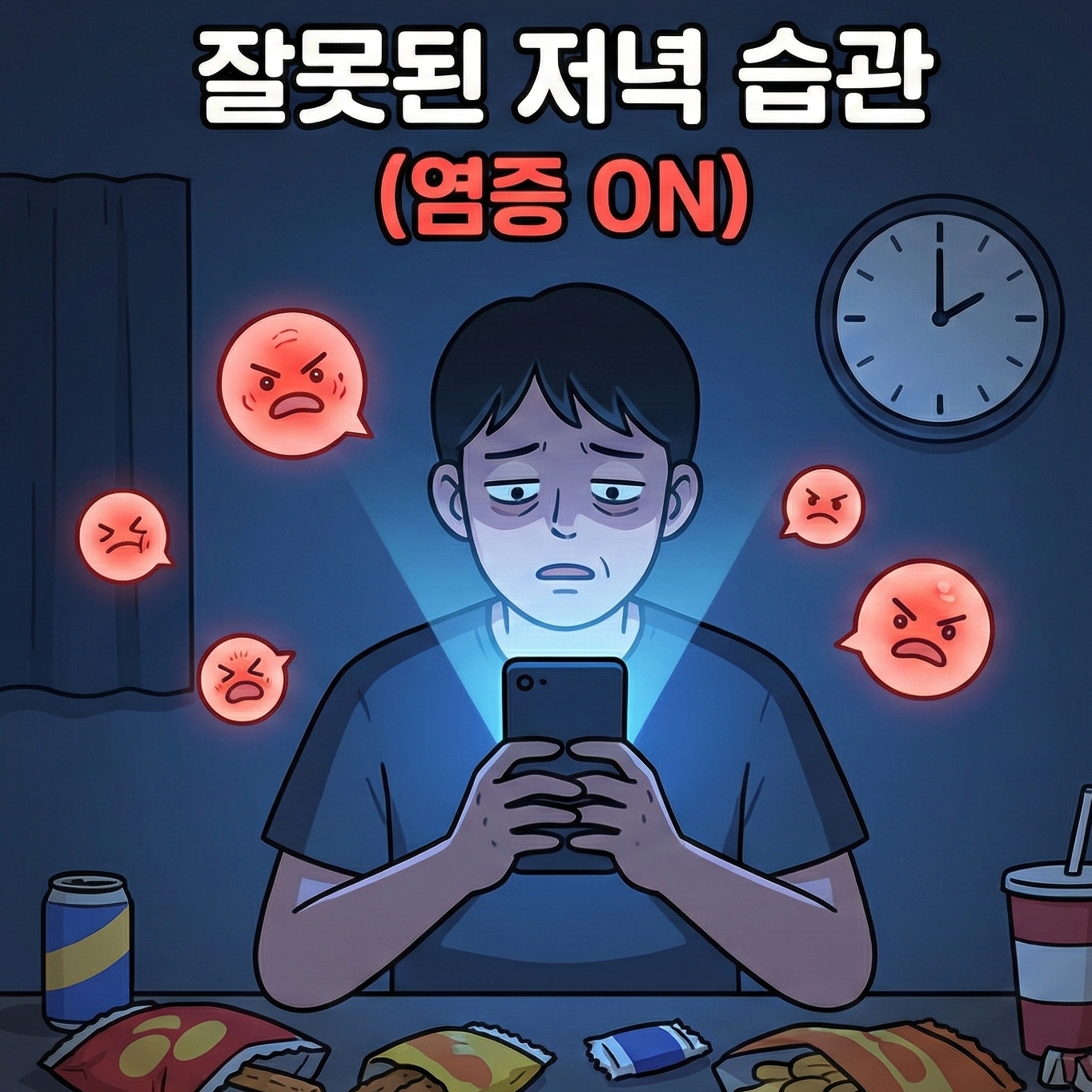 * 혈당 스파이크: 밤늦게 당분을 섭취하면 혈당과 인슐린 수치가 급격히 오르며 만성 염증을 유발합니다.