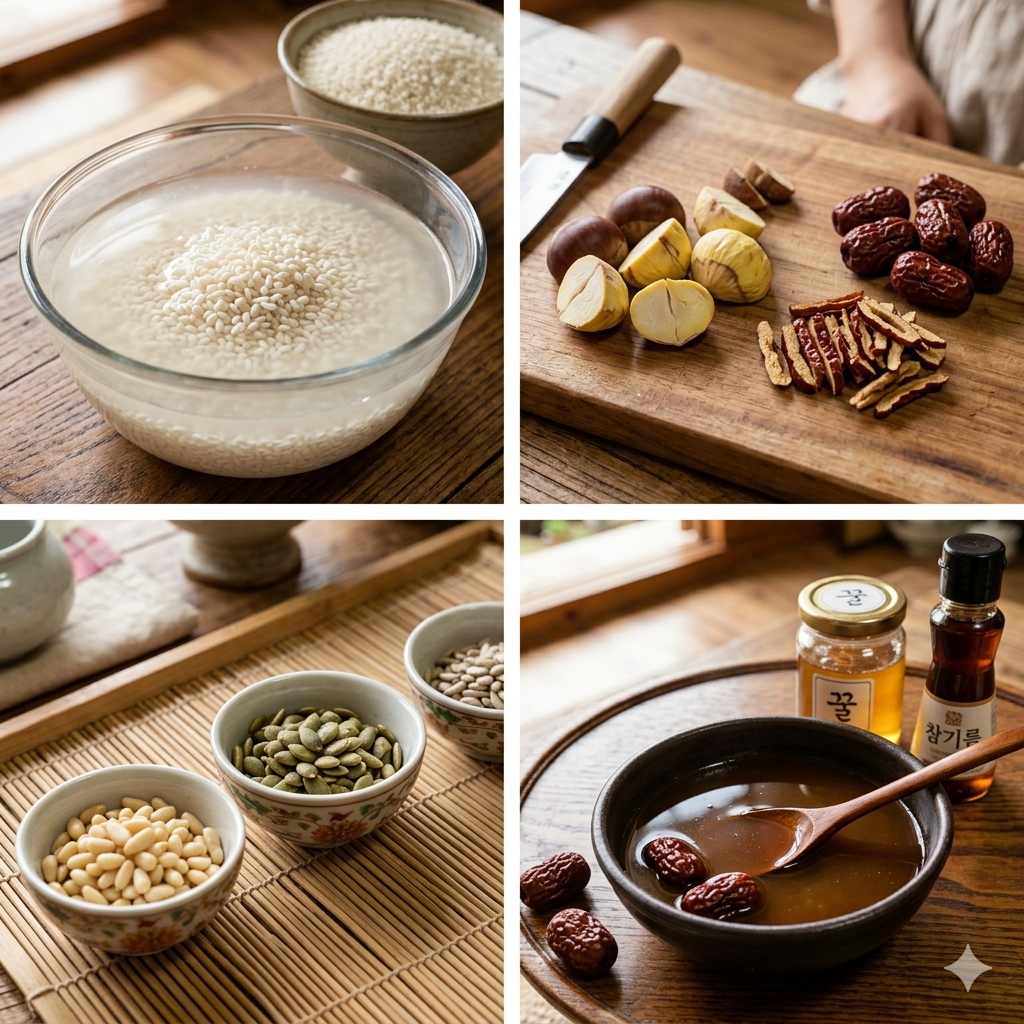 * 주재료: 찹쌀 4컵 (종이컵 기준, 약 600g), 밤 10~15알, 대추 15알, 잣 2큰술, 호박씨 또는 해바라기씨 약간.