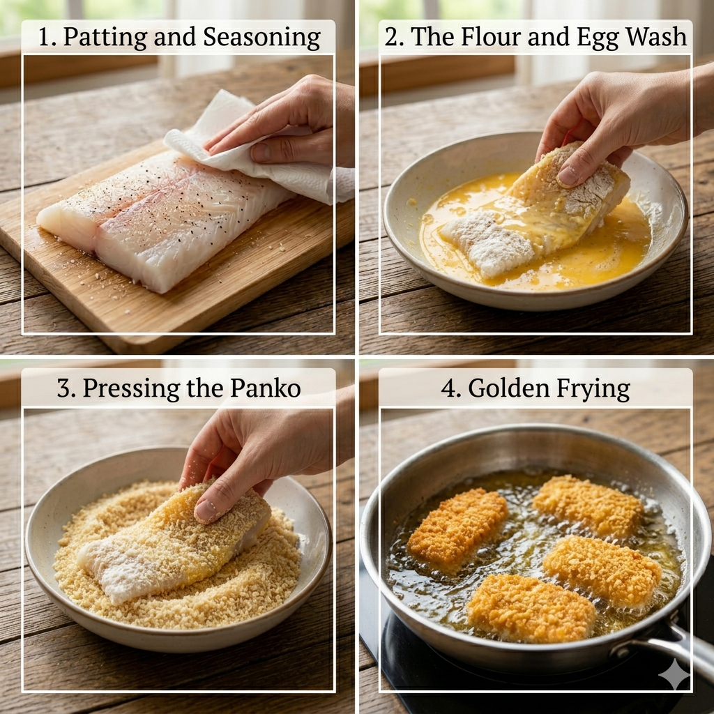 * 물기 제거: 생선의 물기를 완벽하게 제거해야 빵가루가 잘 입혀지고 바삭하게 튀겨집니다. 키친타월로 생선의 앞뒤 물기를 꼼꼼하게 닦아내야 합니다.