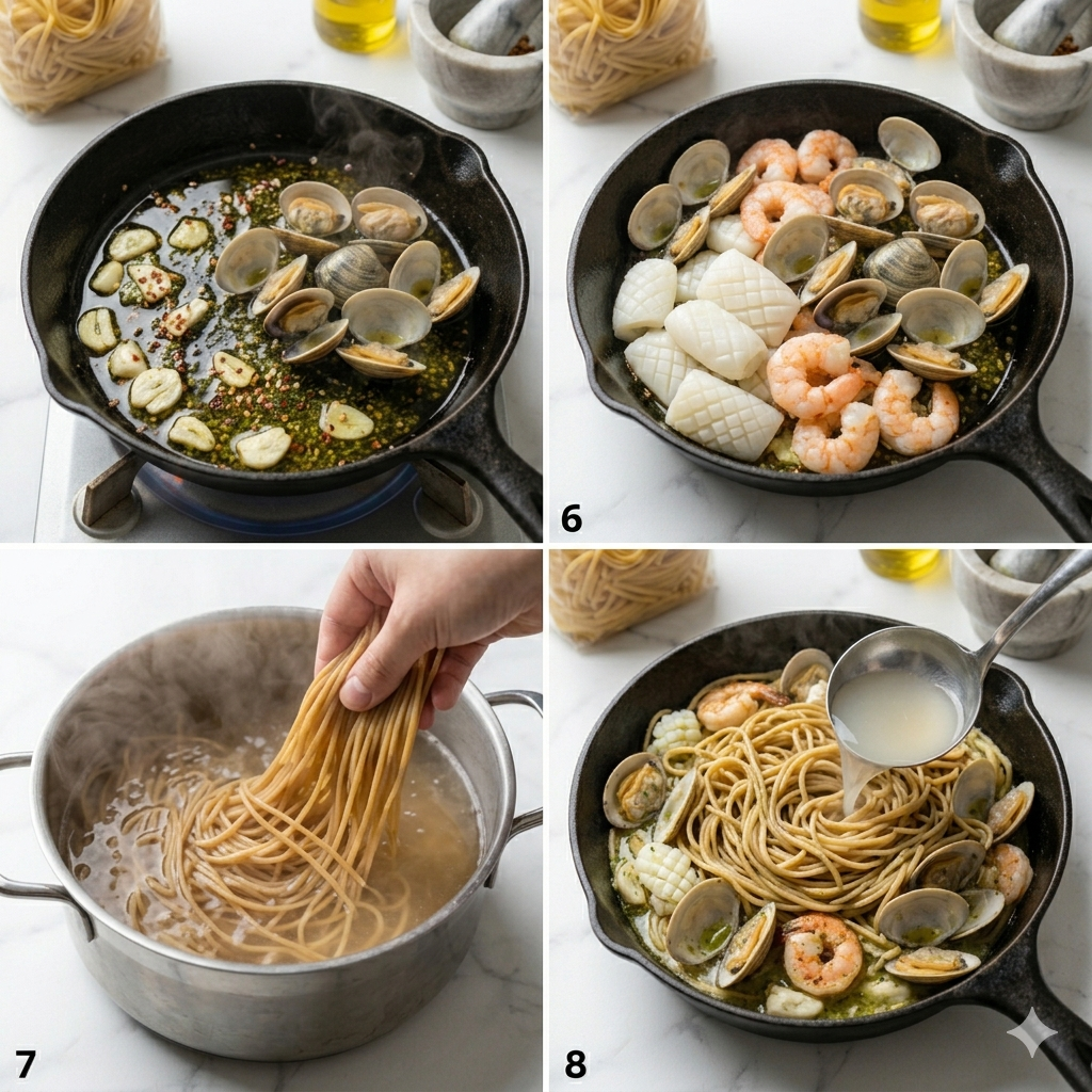 * 메인 재료: 통밀 파스타 면 180g, 갑오징어 1마리(중형), 칵테일 새우 10마리, 바지락 200g.