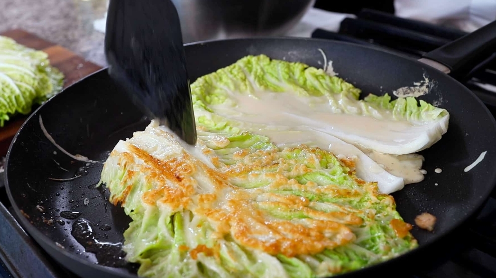 이 농도는 팬에 올렸을 때 배추 잎 전체를 균일하게 감싸며 구웠을 때 형태를 잘 유지하게 해줍니다.