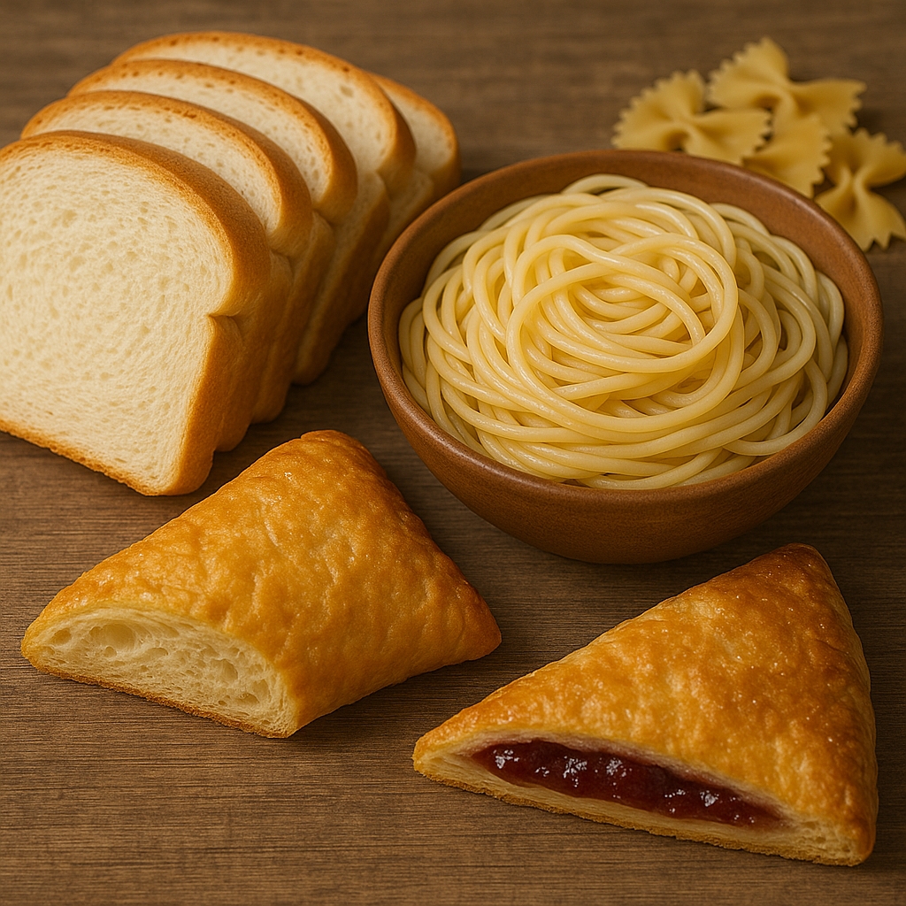 흰 밀가루로 만든 빵, 파스타, 페이스트리는 섬유질과 미량 영양소가 제거된 대표적 가공식품입니다.
