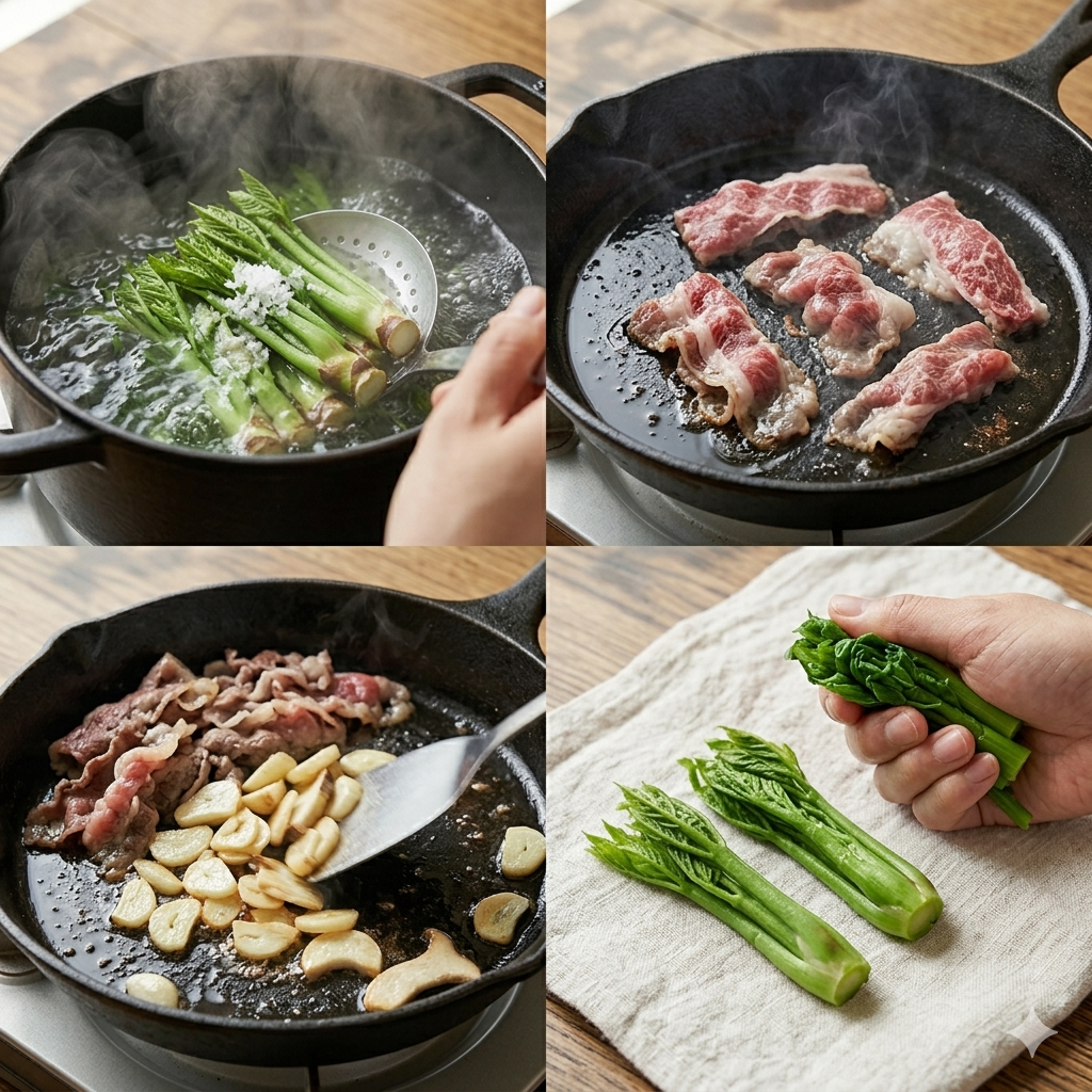 * 데치기: 끓는 물에 소금 1큰술을 넣고 밑동부터 넣어 약 30초간 데친 후 전체를 담가 30초 더 익힙니다. 찬물에 바로 헹궈 물기를 꽉 짜야 아삭한 식감이 유지됩니다.