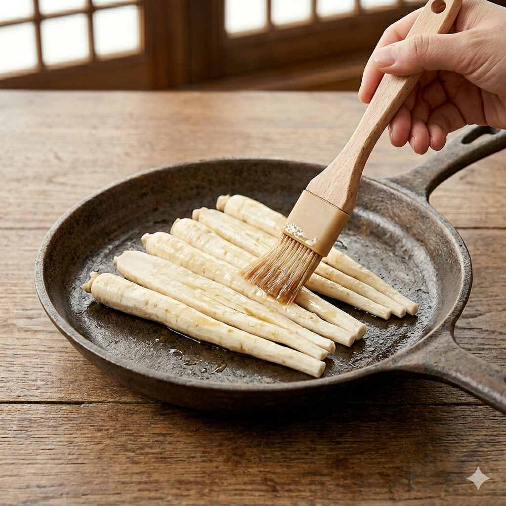 * 유처리(초벌구이): 양념을 바르기 전, 참기름과 간장을 3:1 비율로 섞어 더덕 앞뒤에 고루 바른 뒤 약불에서 살짝 구워주세요. 이 과정이 있어야 양념이 겉돌지 않고 속까지 깊게 배어듭니다.