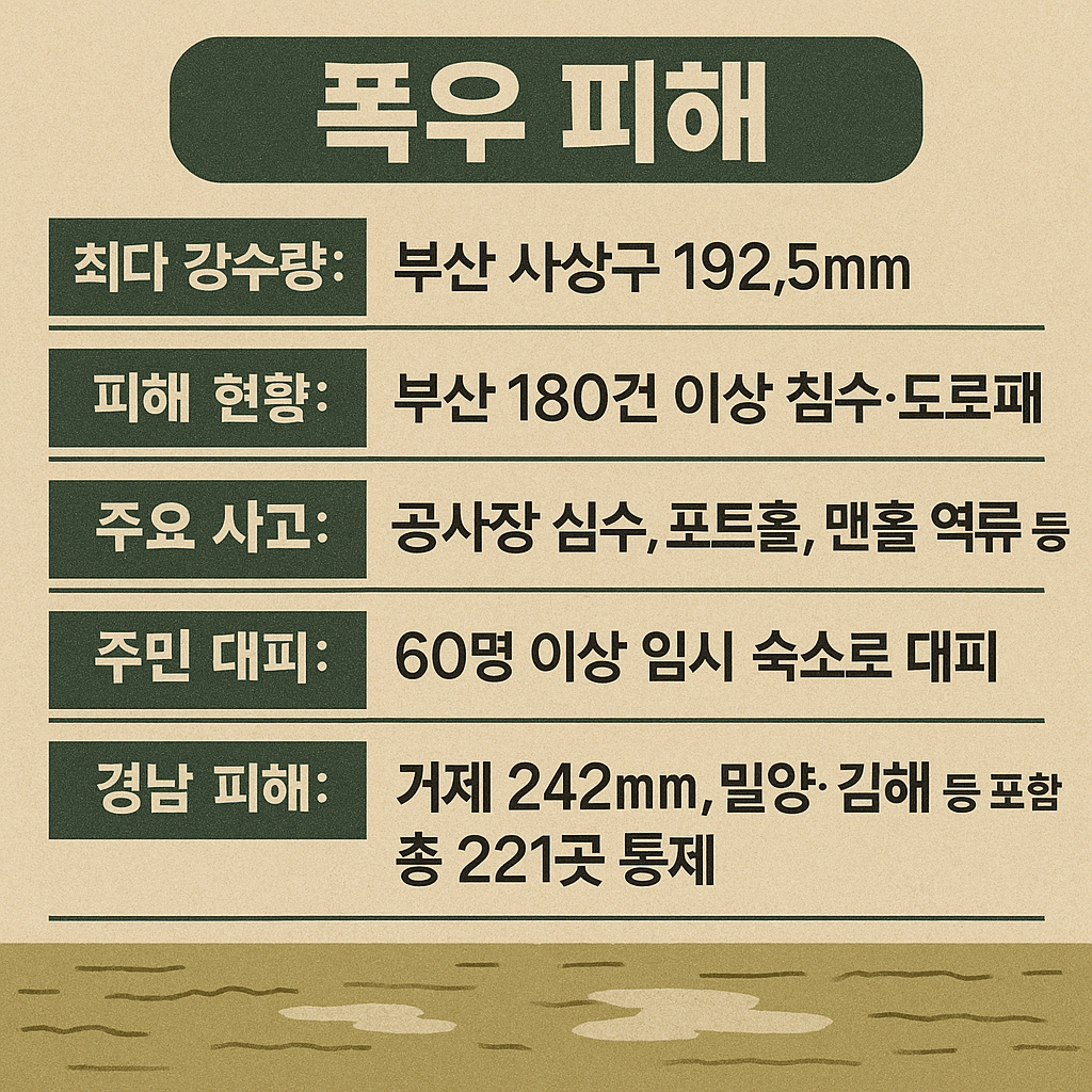 2025년 7월 13일부터 14일 새벽까지 부산과 경남 지역을 강타한 폭우는 단순한 자연재해를 넘어 도심 기능을 마비시키는 ‘물폭탄’ 수준의 위력을 보여주었습니다.