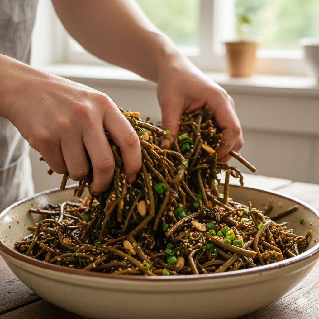 볼에 손질한 고사리를 넣고 국간장, 액젓, 다진 마늘, 들기름을 넣어 조물조물 버무려 10분간 재워두세요. 간이 속까지 배어들어 겉돌지 않습니다.