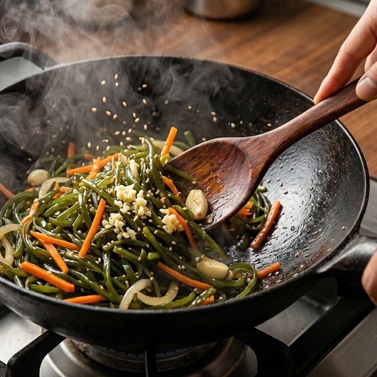 마늘 향이 올라오면 미역줄기를 넣고 강불에서 2분간 충분히 볶아 수분을 날려주세요.
