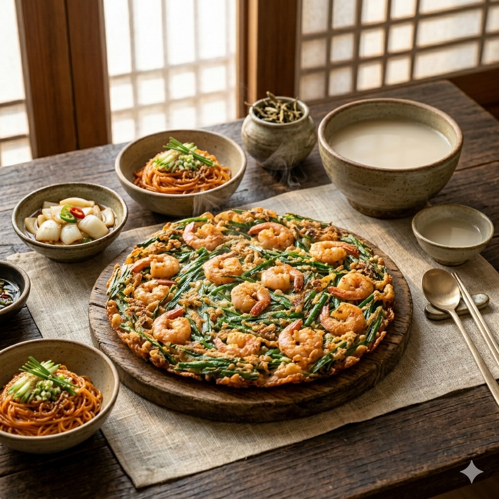 * 비빔국수: 매콤새콤한 양념의 국수는 부추전의 고소함과 대비되어 끝까지 질리지 않게 도와줍니다.