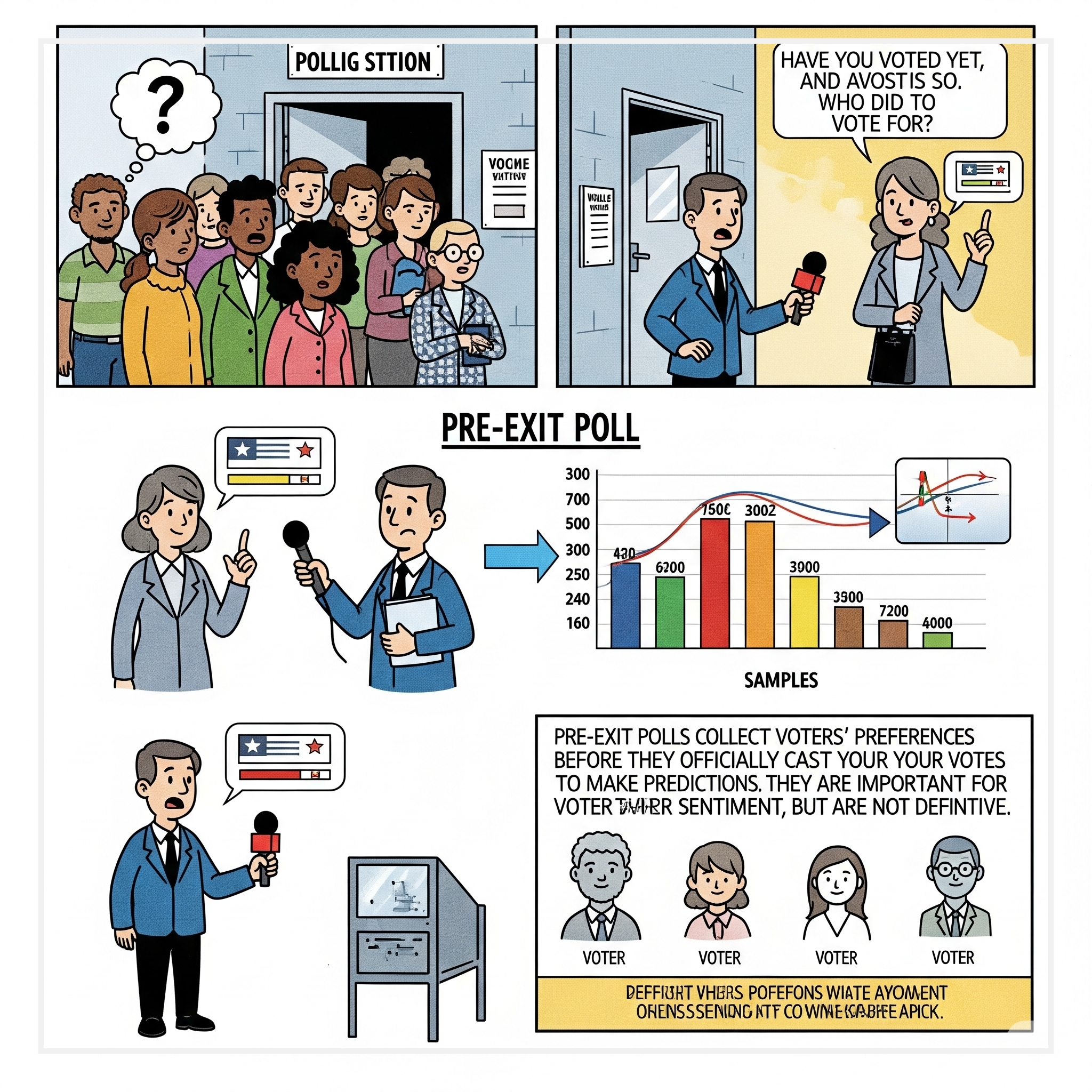 예를 들어, 전국 수백 개 사전투표소 중 무작위로 선정된 약 300곳에서 조사원들이 배치되며, 연령, 성별, 지역 비율을 반영해 샘플링합니다.
