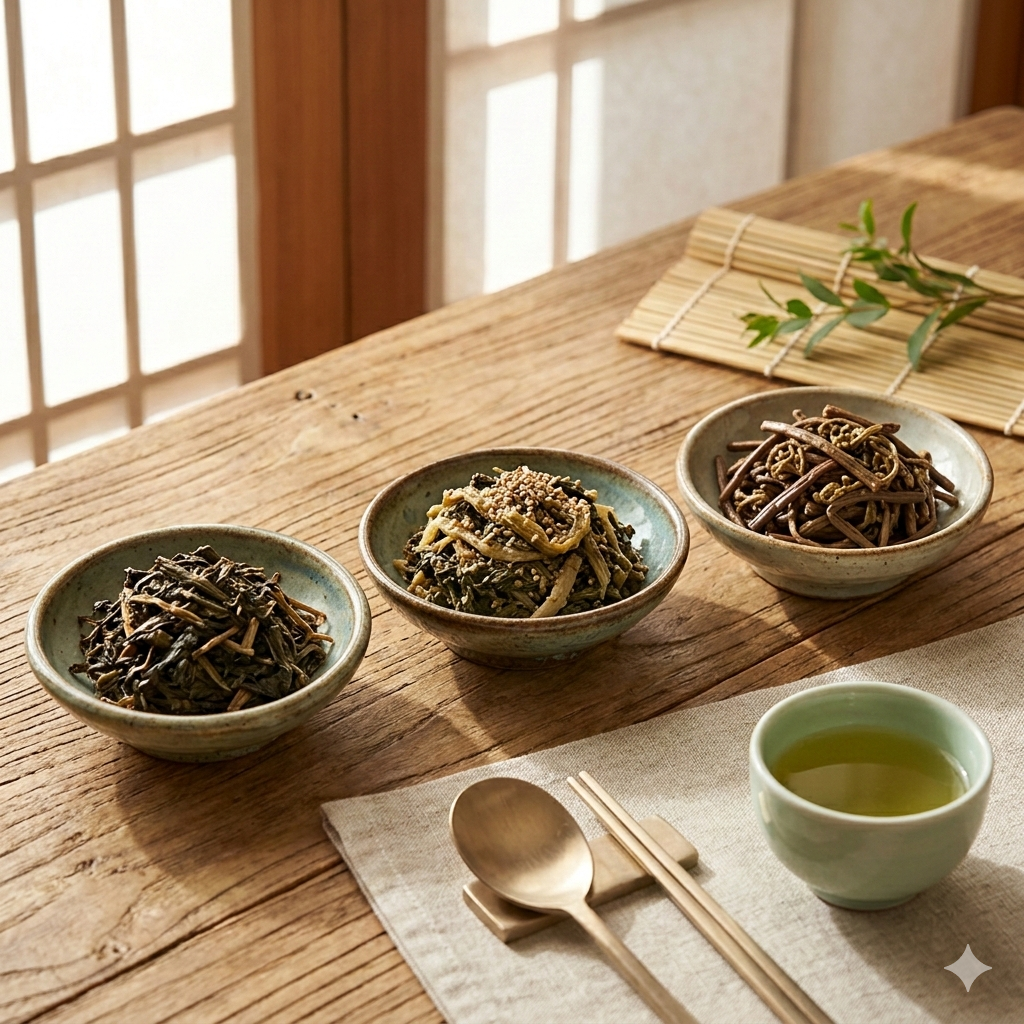 오늘은 자극적인 양념 대신 들깨의 고소함과 채수의 깊은 맛으로 완성하는 사찰식 건나물 3종(시래기, 취나물, 고사리) 레시피를 소개합니다.