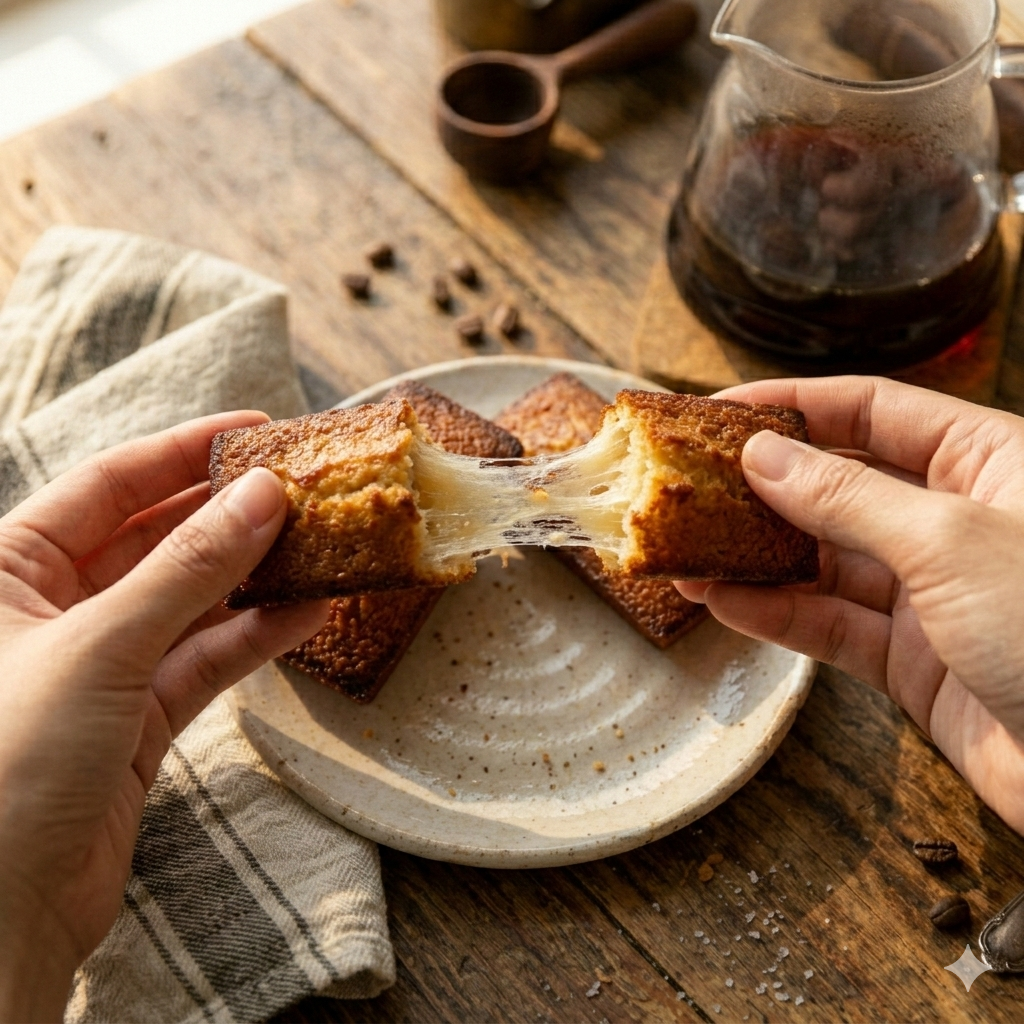 맛은 휘낭시에와 비슷하면서도 밀가루가 아닌 찹쌀을 사용해 훨씬 쫀득하고 크리미한 고소함이 특징입니다.