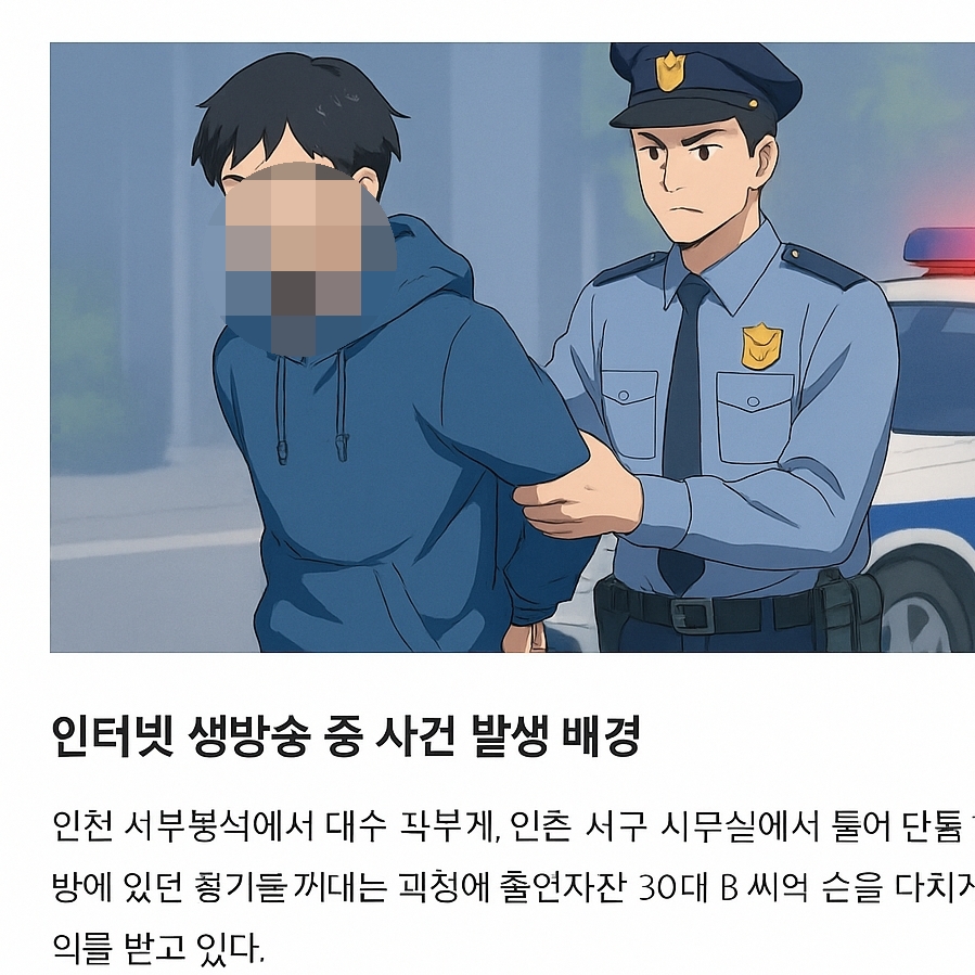 2025년 8월 31일 새벽, 인천 서구의 한 사무실에서 인터넷 생방송을 진행하던 20대 유튜버 A씨가 방송 도중 출연자 B씨에게 부상을 입히는 사고가 발생했습니다.
