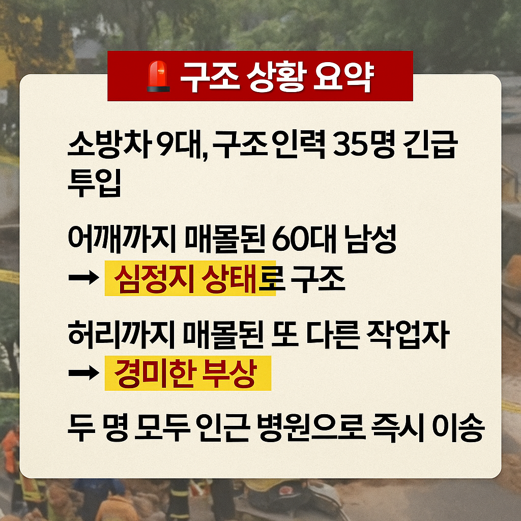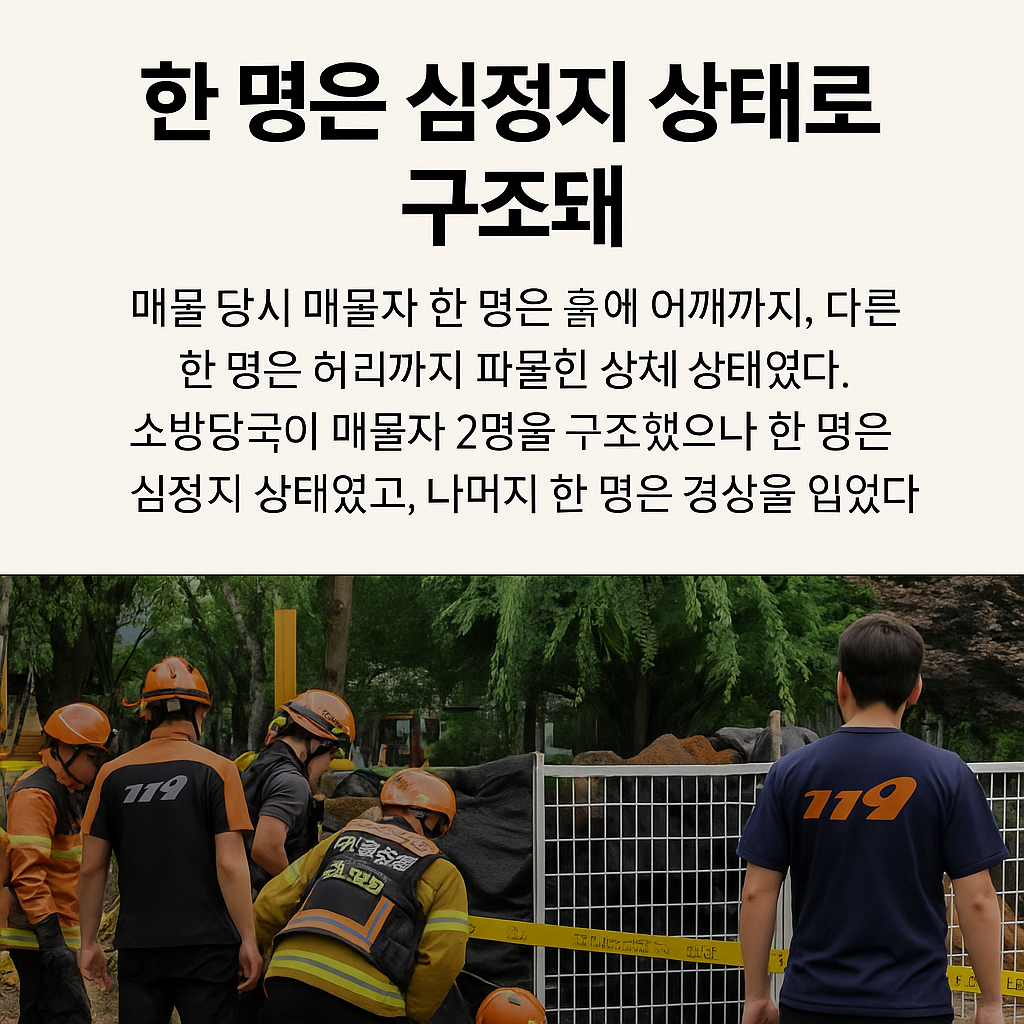 현장에서는 50대 작업자 2명이 각각 어깨와 허리까지 흙에 묻힌 상태로 발견되었으며, 신속한 구조가 이루어졌다. 이 중 60대 남성 1명은 심정지 상태로 구조됐고, 나머지 1명은 경미한 발목 부상을 입은 것으로 확인됐다.
