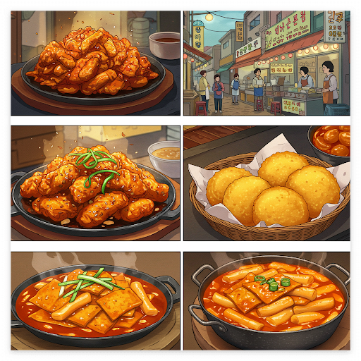 - 다양한 먹거리 (닭강정, 고로케, 떡 등)