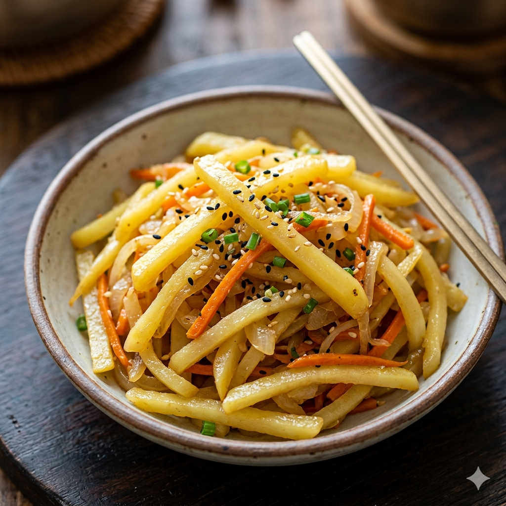 * 감자채 볶기: 감자채를 넣고 센 불에서 빠르게 볶아줍니다. 감자가 투명해지기 시작하면 당근과 양파를 넣고 함께 볶습니다.