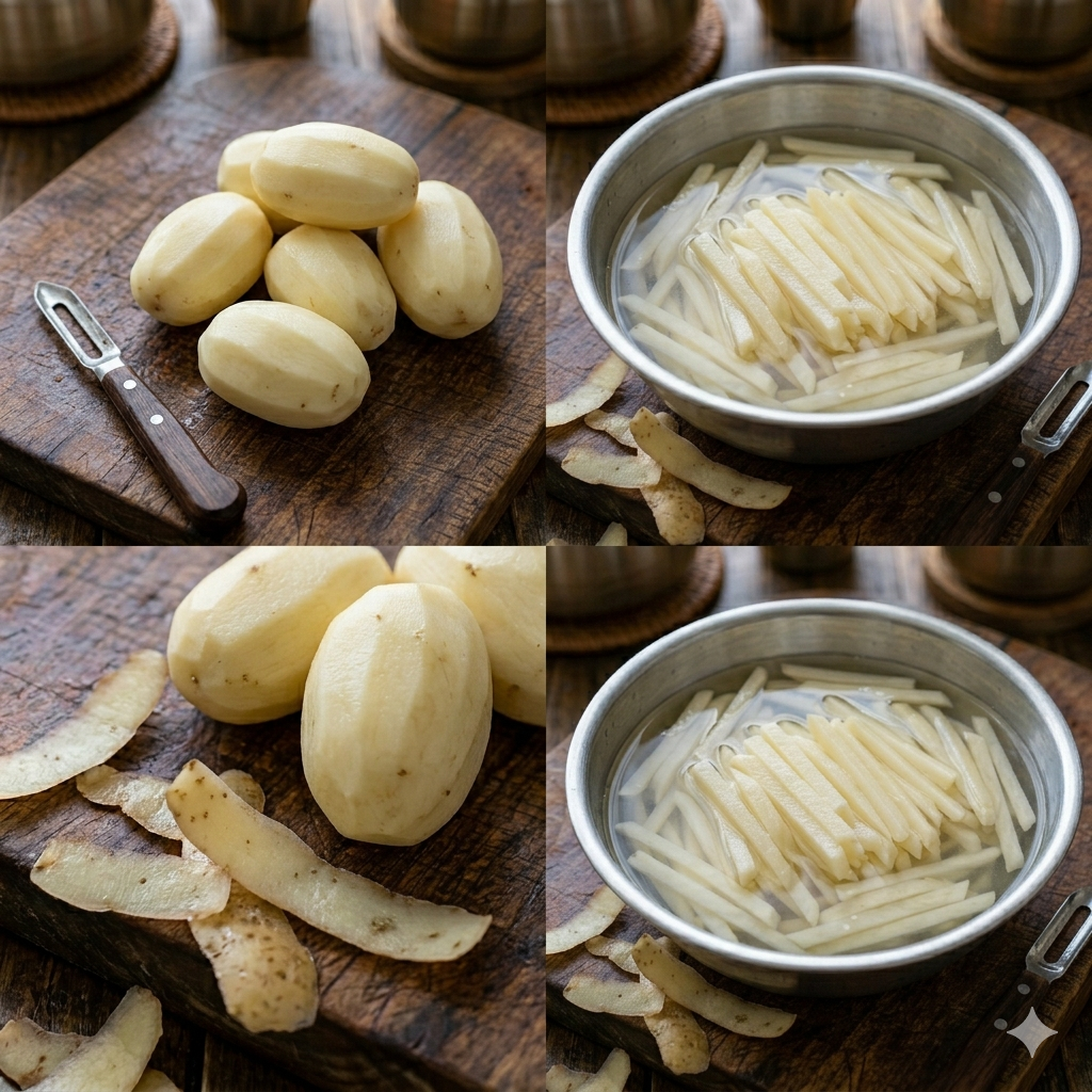 * 전분 제거: 감자에는 전분이 많아 볶을 때 서로 엉겨 붙거나 눌어붙을 수 있습니다. 찬물에 여러 번 헹구어 전분기를 충분히 제거해야 아삭한 식감을 살릴 수 있습니다. (헹군 후 물기를 완전히 제거하는 것이 중요합니다!)