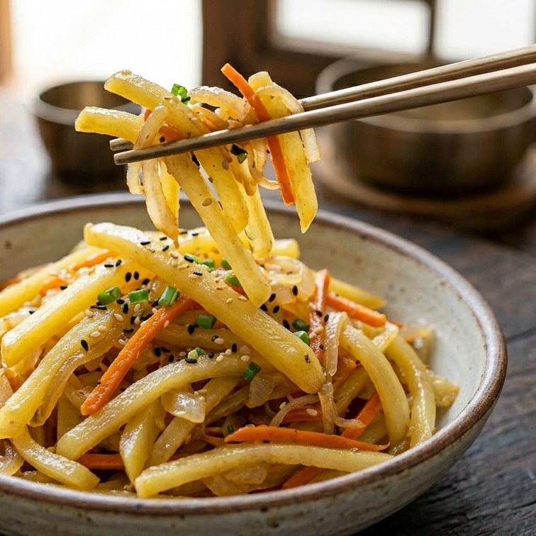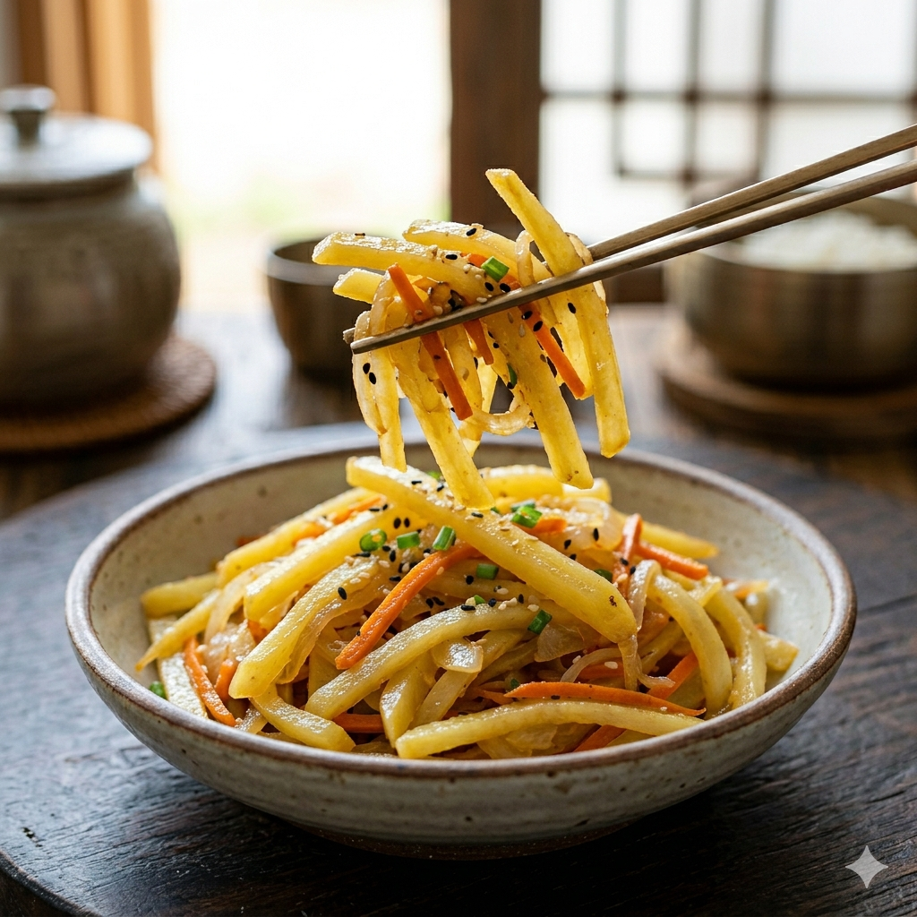 * 센 불에서 빠르게: 감자채는 센 불에서 빠르게 볶아내야 수분이 덜 빠져나와 아삭한 식감을 유지할 수 있습니다.