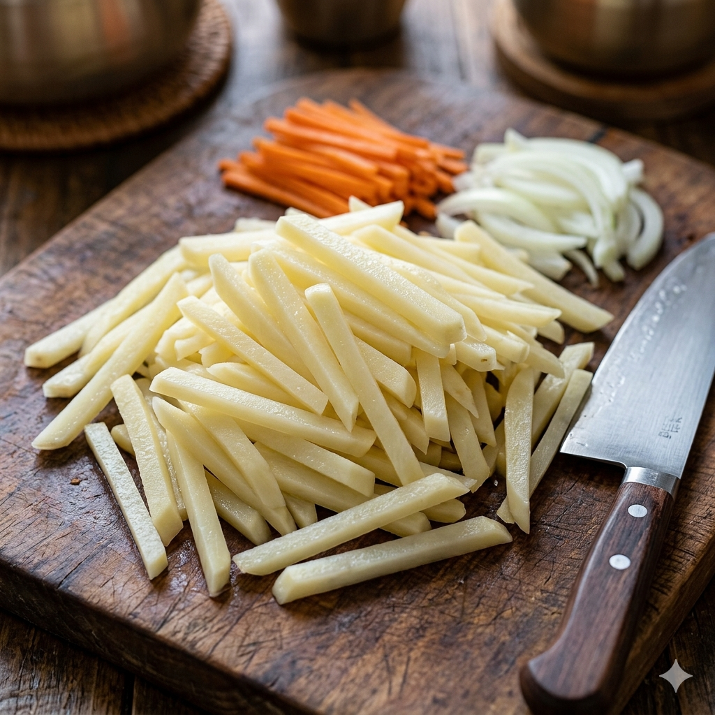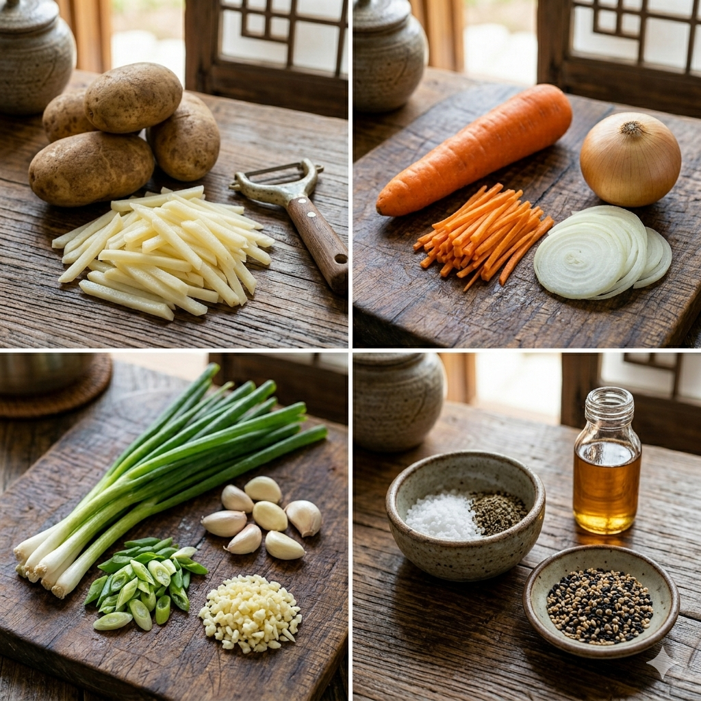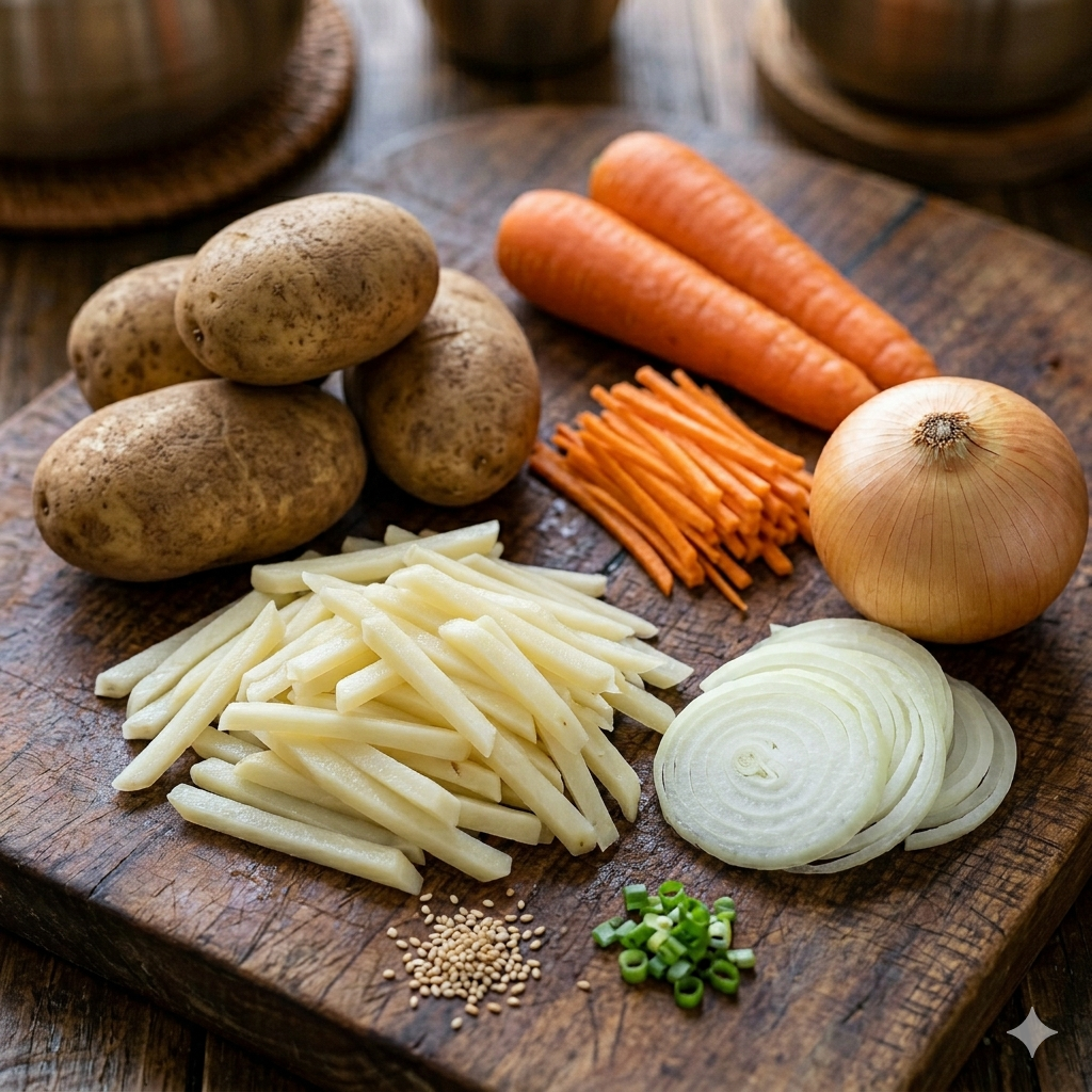 * 채소 손질: 당근과 양파도 감자채와 비슷한 크기로 채 썹니다. 대파는 어슷 썹니다.