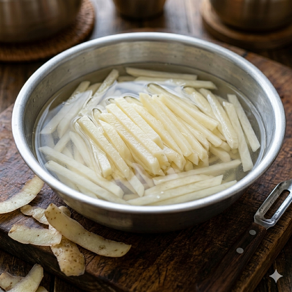 * 갈변 방지: 감자는 껍질을 벗기면 공기와 닿아 쉽게 갈변합니다. 이를 방지하기 위해 썰어놓은 감자채는 즉시 찬물에 담가두어야 합니다.