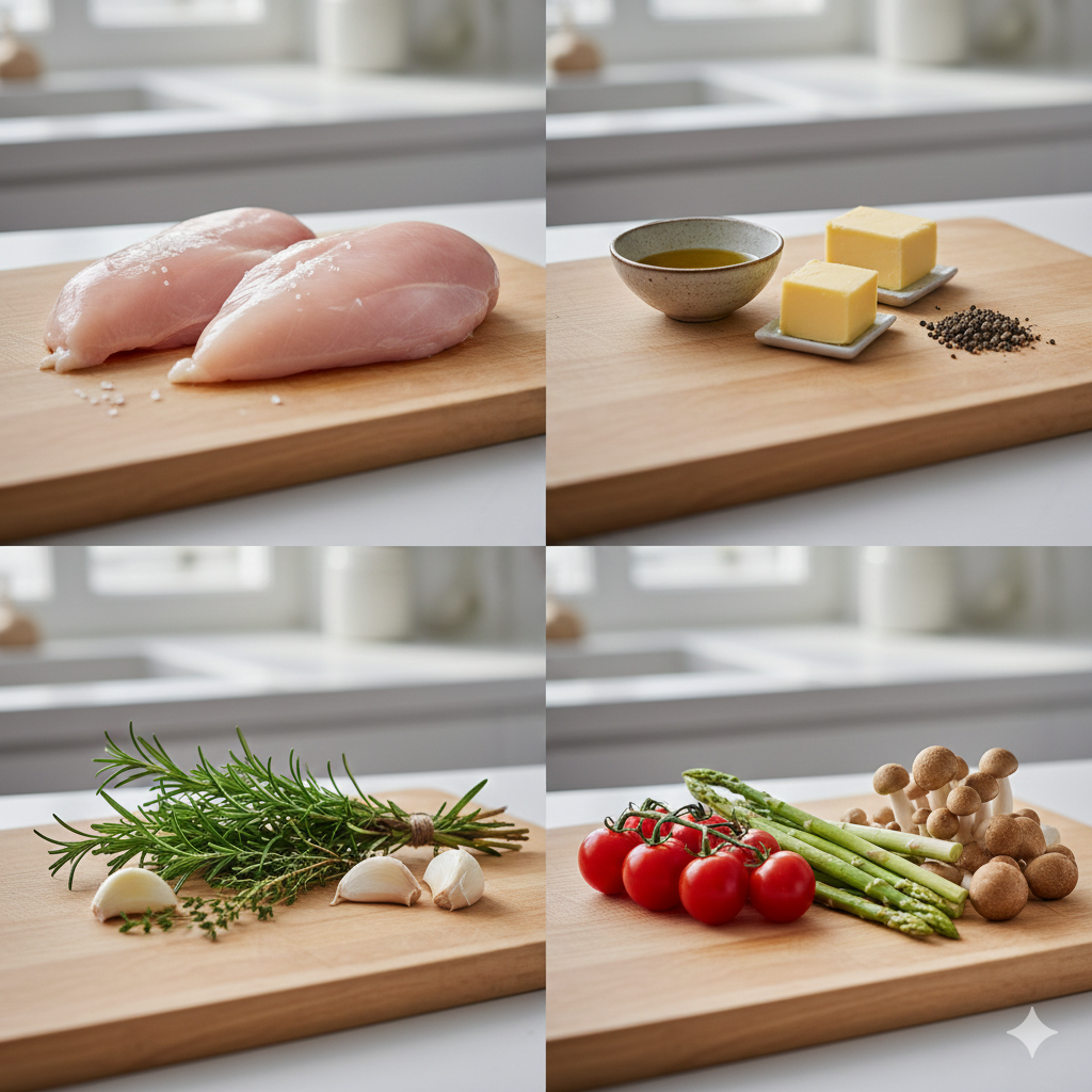 * 시즈닝: 올리브유 2큰술, 버터 10g, 소금 1/2작은술, 후추 약간, 로즈마리(혹은 타임) 1줄기, 마늘 2알