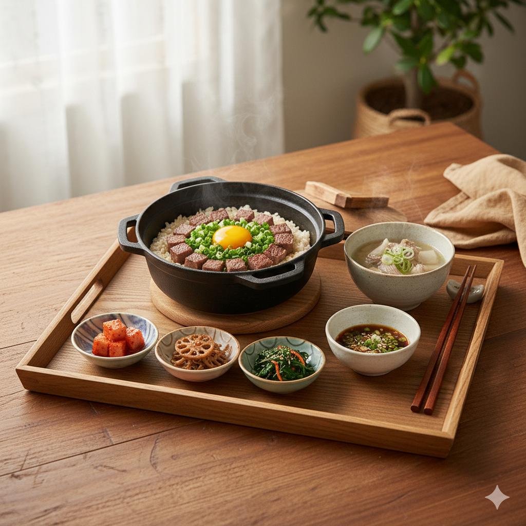 * 맑은 소고기 무국: 따뜻하고 깔끔한 국물은 솥밥의 묵직한 맛을 정돈해 줍니다.
