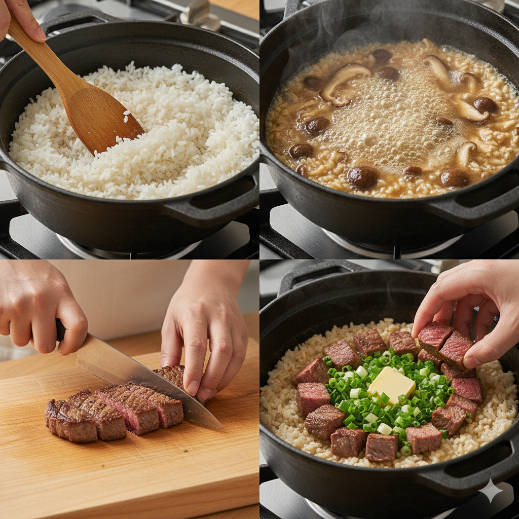 * 주재료: 고시히카리 또는 수향미(향미) 2컵, 소고기 채끝 스테이크용 300g, 만닥버섯 또는 표고버섯 100g.