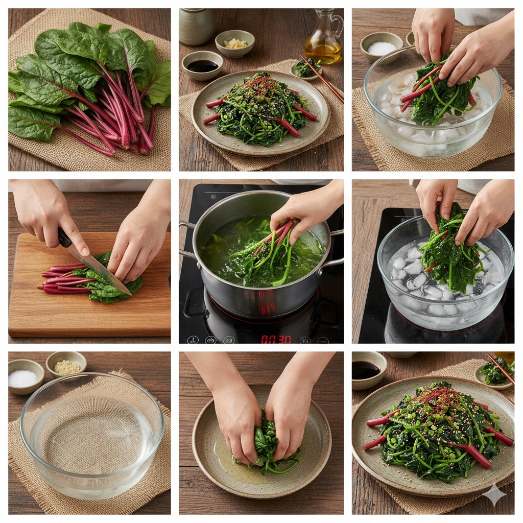 뜨거운 시금치에 남아있는 '잔열'을 순식간에 빼앗아 더 이상 익는 것을(Overcooking) 완벽하게 차단합니다. 이것이 바로 시금치가 물컹거리지 않고 아삭한 식감을 유지하는 두 번째 비결입니다.