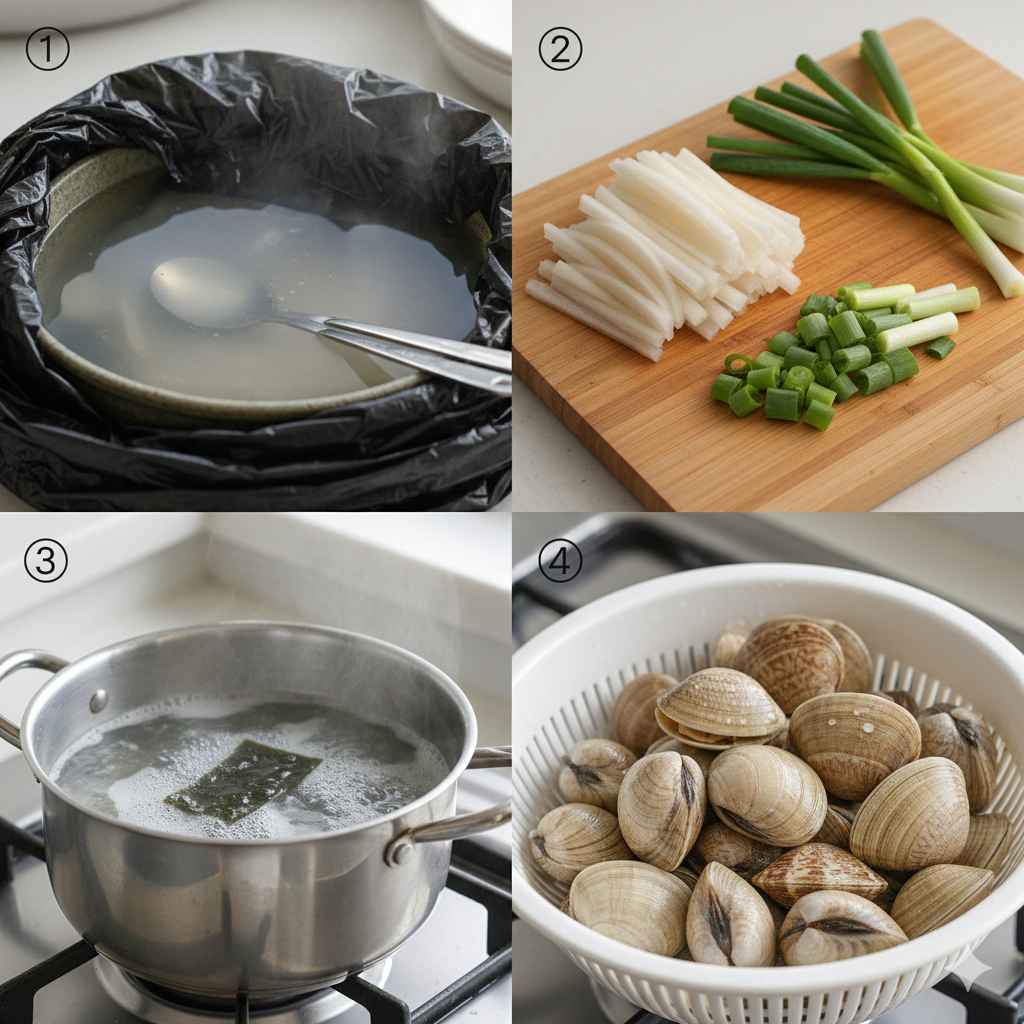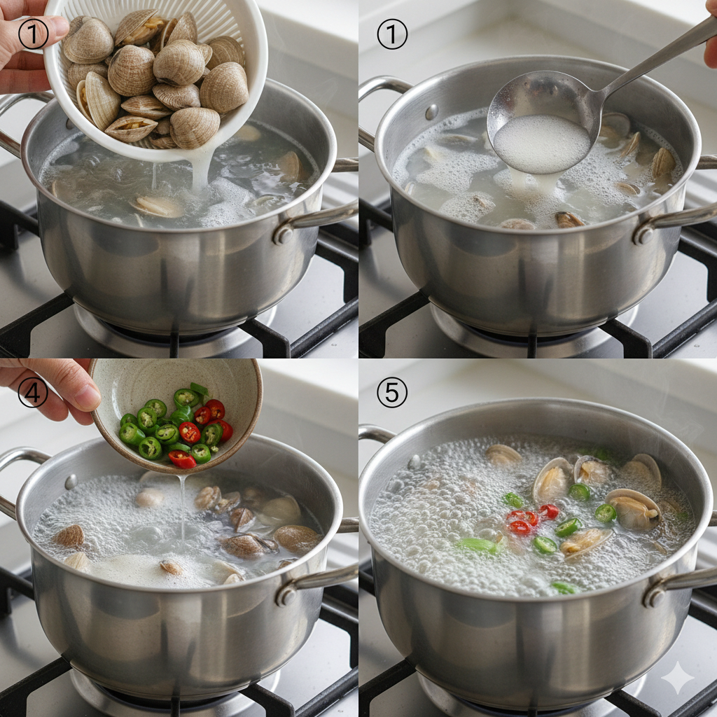 * 찬물부터 시작하기: 조개류는 찬물에서부터 넣고 끓여야 단백질이 천천히 응고되면서 깊은 맛이 더 잘 우러납니다.