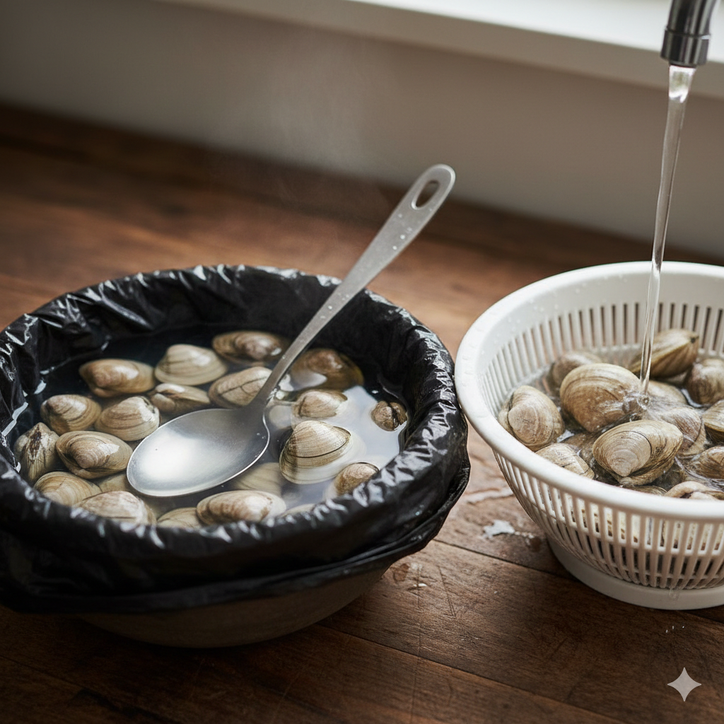 * 어두운 환경 조성: 바지락을 넣고 검은 비닐봉지를 씌우거나 어두운 곳에 2~3시간 둡니다. 이때 쇠숟가락을 함께 넣으면 금속 성분과의 화학 반응으로 바지락이 입을 더 활발하게 벌려 이물질을 빨리 뱉어냅니다.