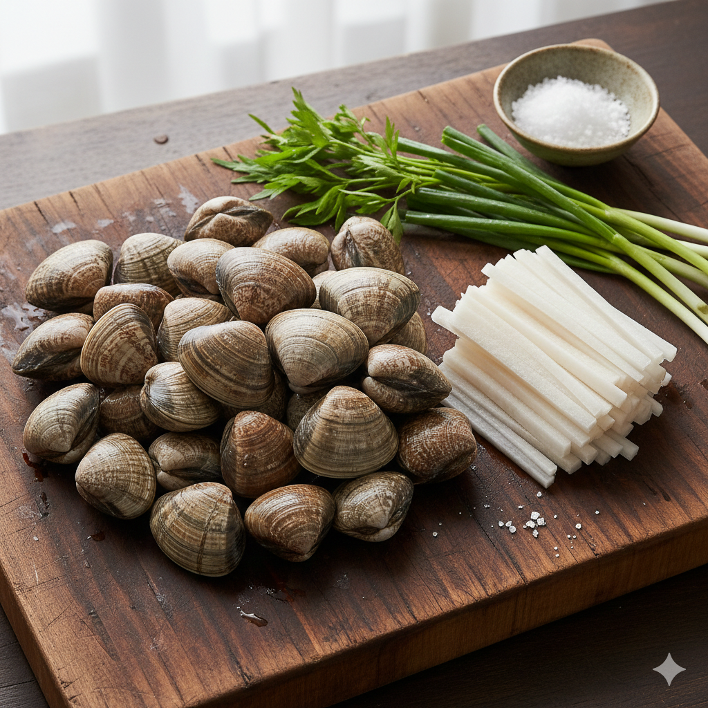 * 메인 재료: 신선한 바지락 500g (가급적 생물 권장)