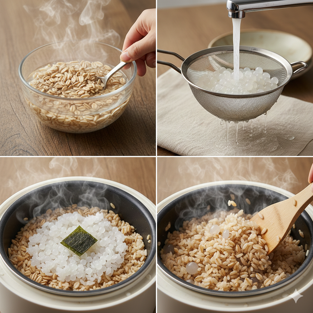 귀리는 식감이 거칠기 때문에 최소 30분에서 1시간 이상 충분히 불려주는 것이 좋습니다. 곤약쌀은 채반에 받쳐 흐르는 물에 여러 번 헹궈 물기를 완전히 제거해 주세요.