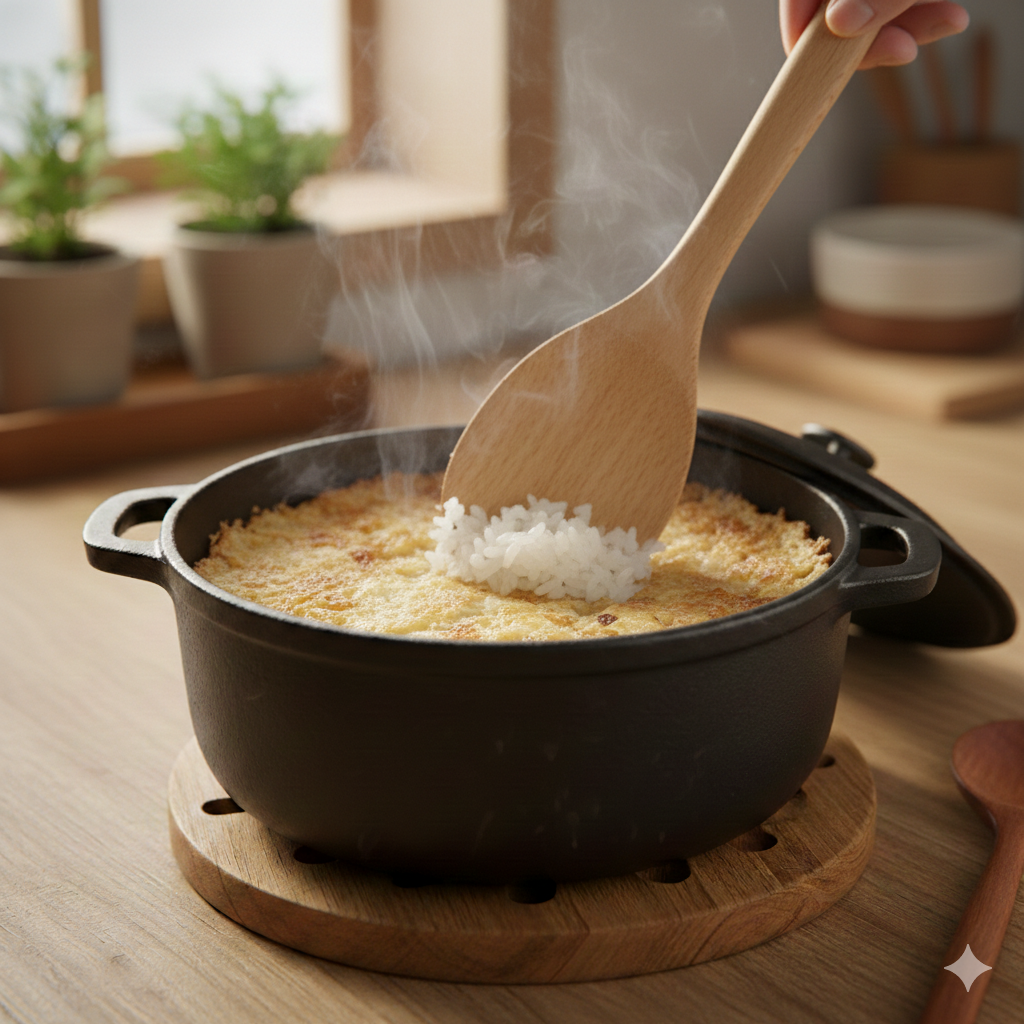 밥이 다 익었을 무렵, 구수한 냄새가 살짝 올라오기 시작하면 불을 끄지 않고 약불을 2~3분 더 유지합니다. 이때 바닥의 수분이 날아가면서 바삭한 누룽지가 형성됩니다. '탁탁' 하는 미세한 소리가 들리면 최적의 타이밍입니다.