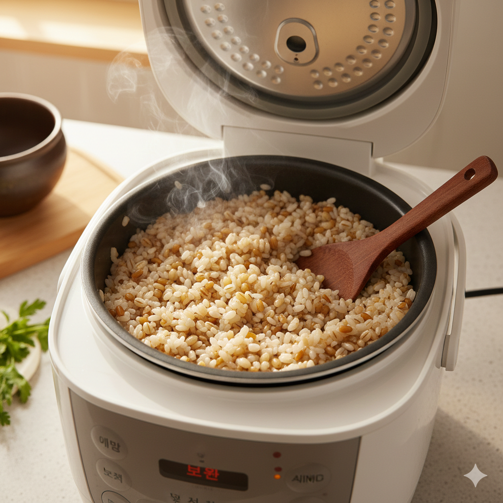 쌀과 보리를 섞어 평소보다 물의 양을 아주 조금만 더 잡아 취사 버튼을 눌러주세요.