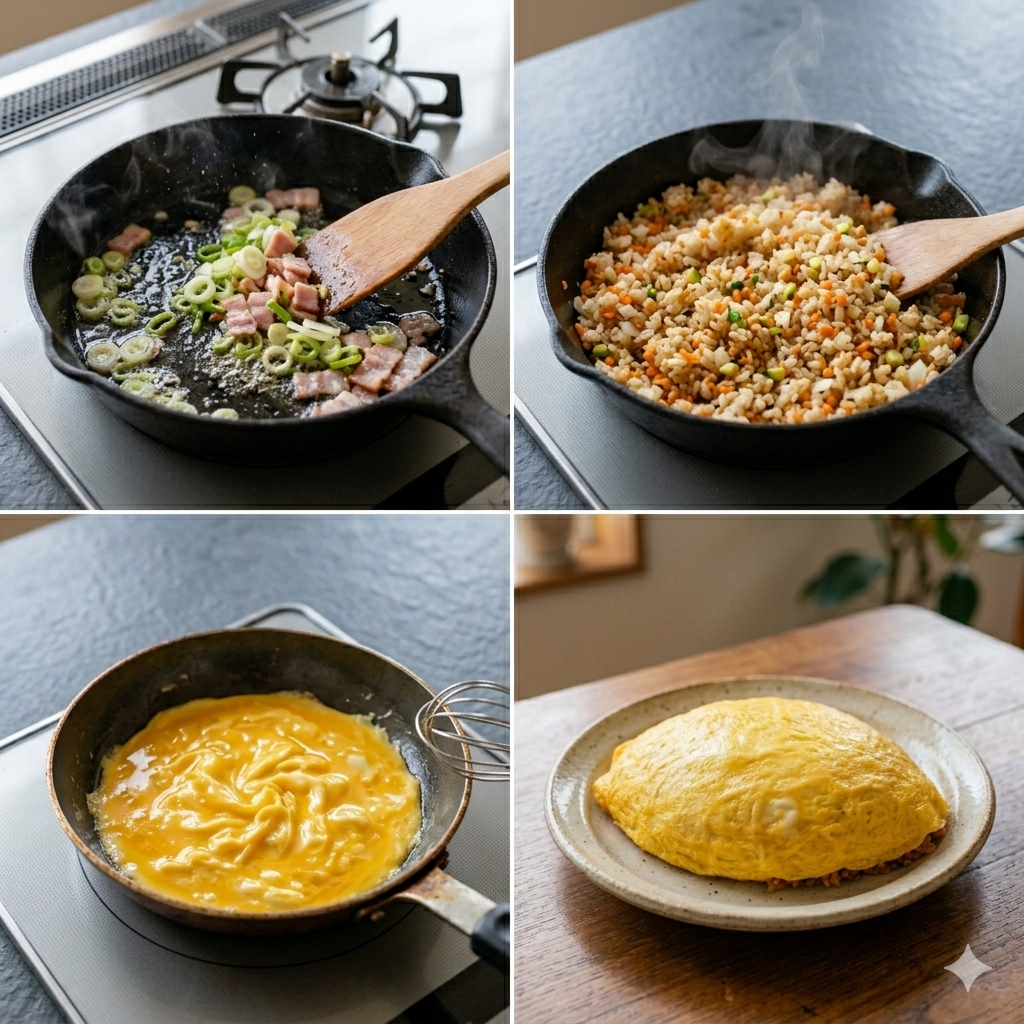 오므라이스의 핵심은 소스가 밥알 하나하나에 코팅되는 것입니다.