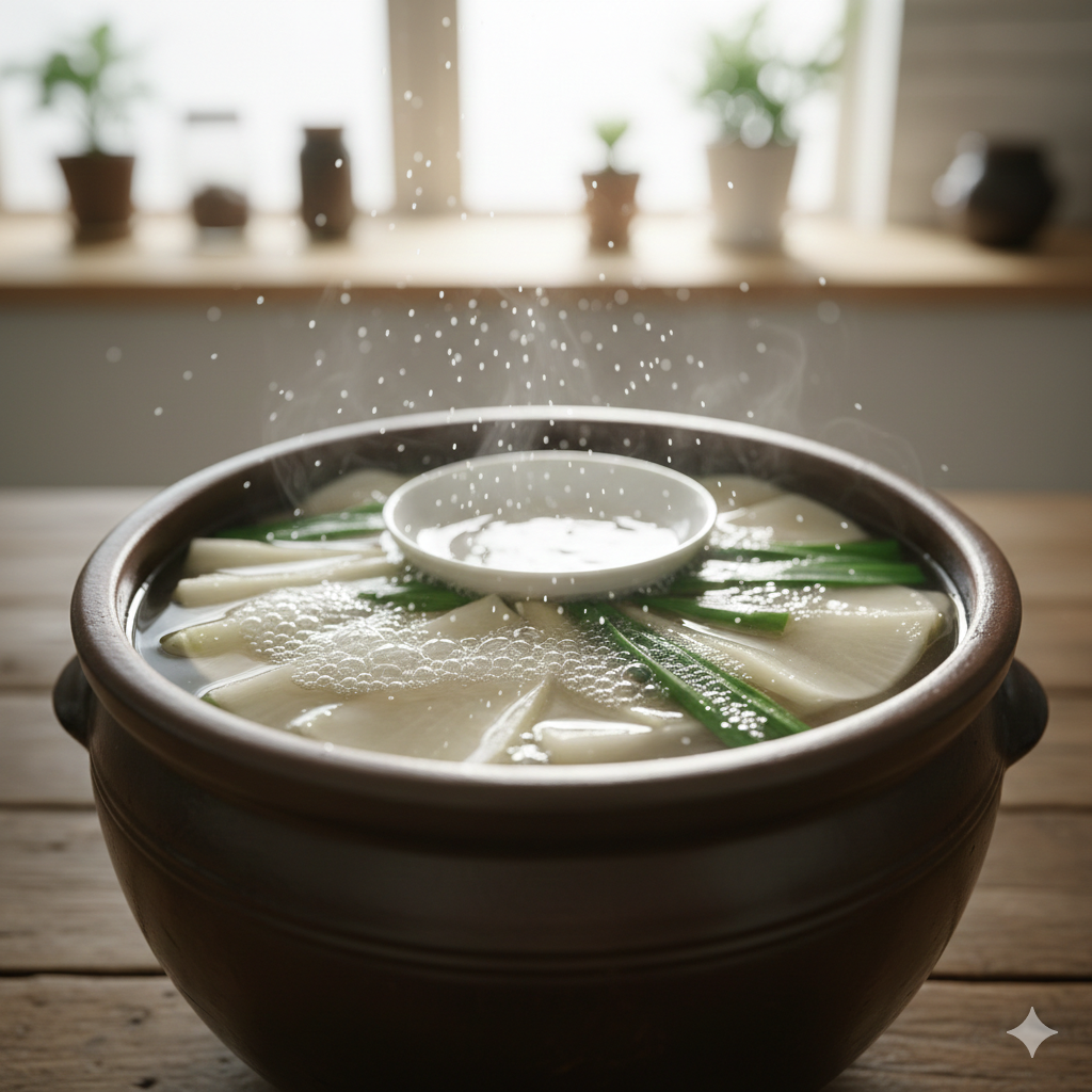 : 정제염보다는 미네랄이 풍부한 간수를 뺀 국내산 천일염을 사용해야 국물 맛이 쓰지 않고 깔끔합니다.