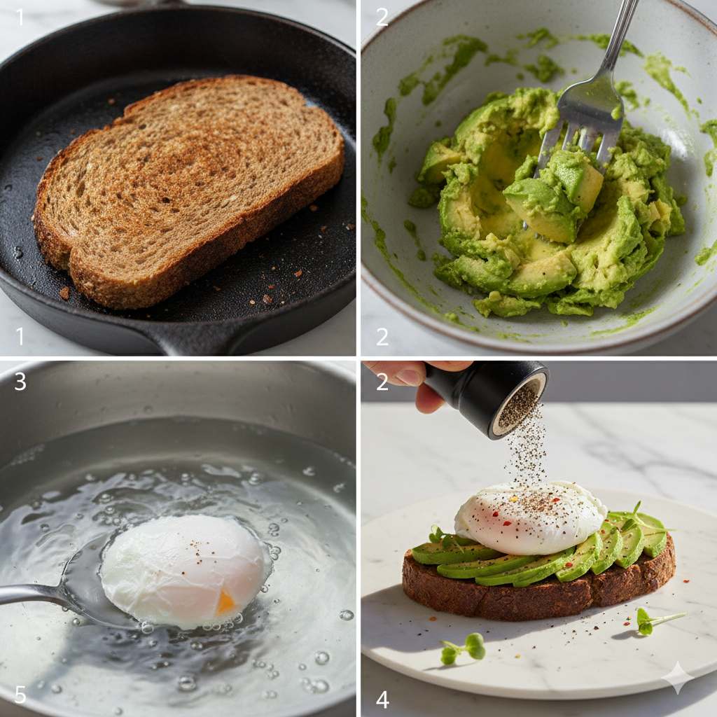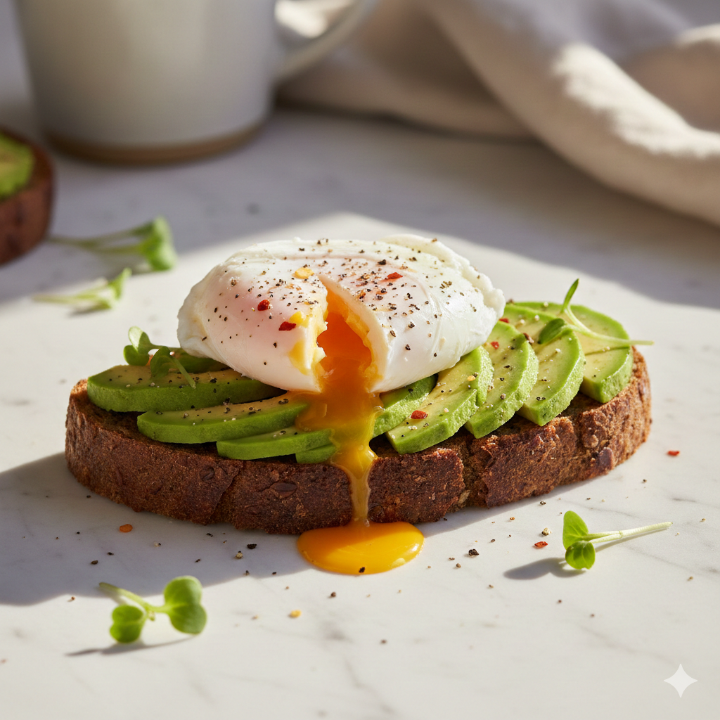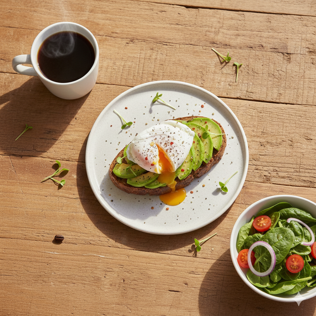 식이섬유가 풍부한 복합 탄수화물(호밀빵)과 '숲의 버터'라 불리는 불포화 지방산(아보카도), 그리고 완전 단백질인 수란이 만나 완벽한 영양 밸런스를 이룹니다.
