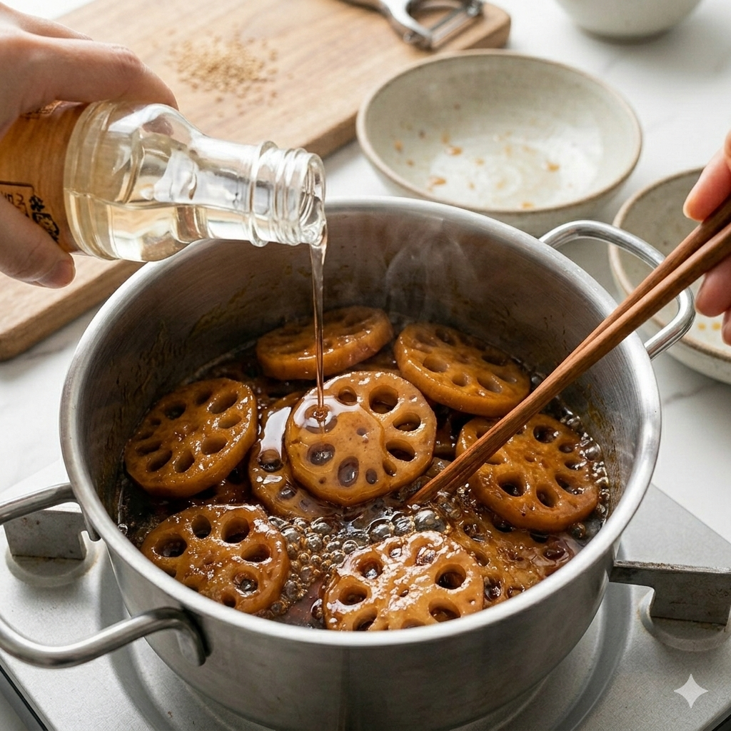 * 불 조절의 미학: 성급하게 강불로만 조리하면 속까지 간이 배지 않습니다. 중약불에서 은근히 졸여야 연근 속까지 갈색빛이 예쁘게 스며듭니다.