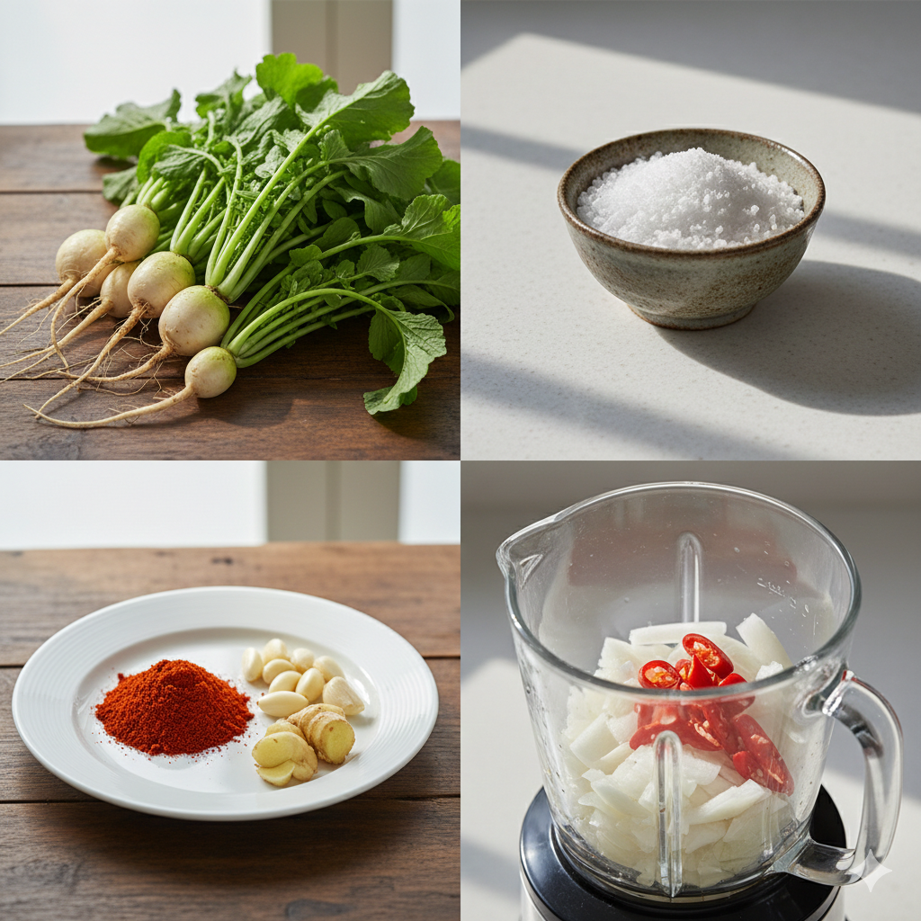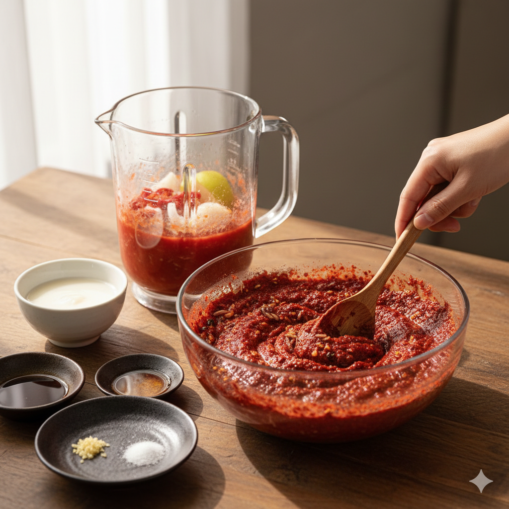 * 최종 배합: 식힌 풀국에 믹서기로 간 재료, 고춧가루, 마늘, 생강, 매실청을 모두 섞어 10분 정도 고춧가루가 불도록 둡니다.