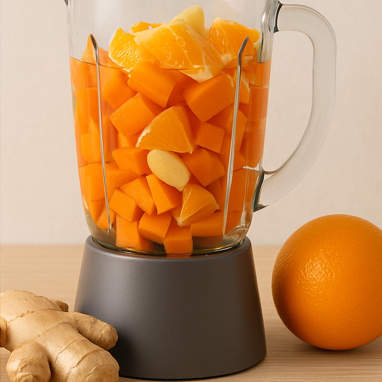 당근, 오렌지, 생강을 물과 함께 갈아 마시면 아침 공복 상태에서 체지방, 특히 뱃살을 줄이는 데 효과가 있다는 주장인데요.