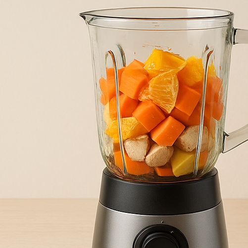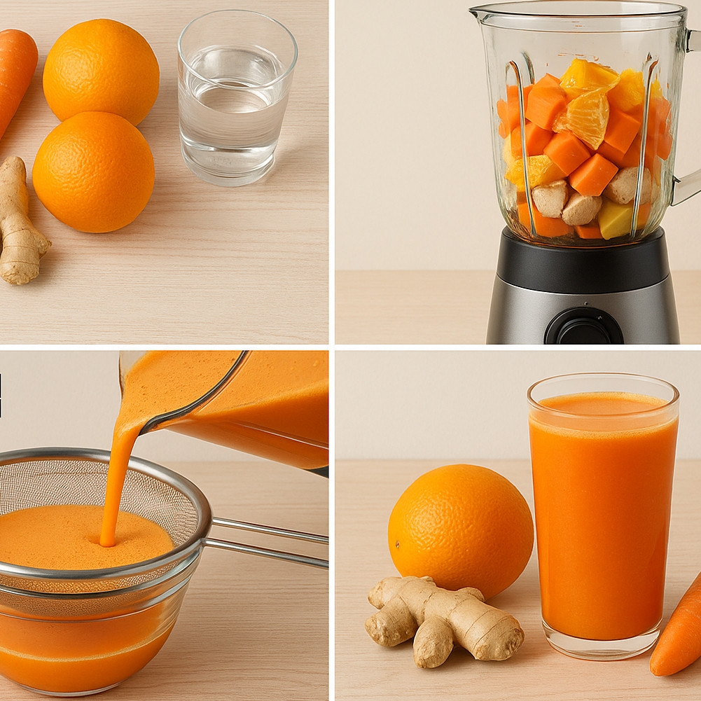 : 오렌지 대신 자몽을 넣어도 좋고, 당근을 찐 뒤 갈면 소화 흡수가 더 편해집니다.