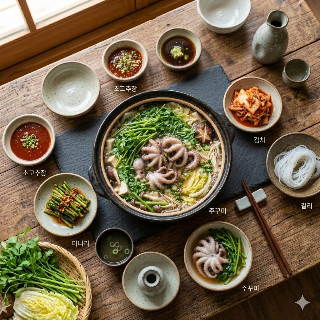 * 미나리의 조화: 향긋한 미나리는 마지막에 살짝 데치듯 넣어 주꾸미와 함께 드세요. 미나리의 성분이 주꾸미의 풍미를 돋우고 해독 작용을 돕습니다.