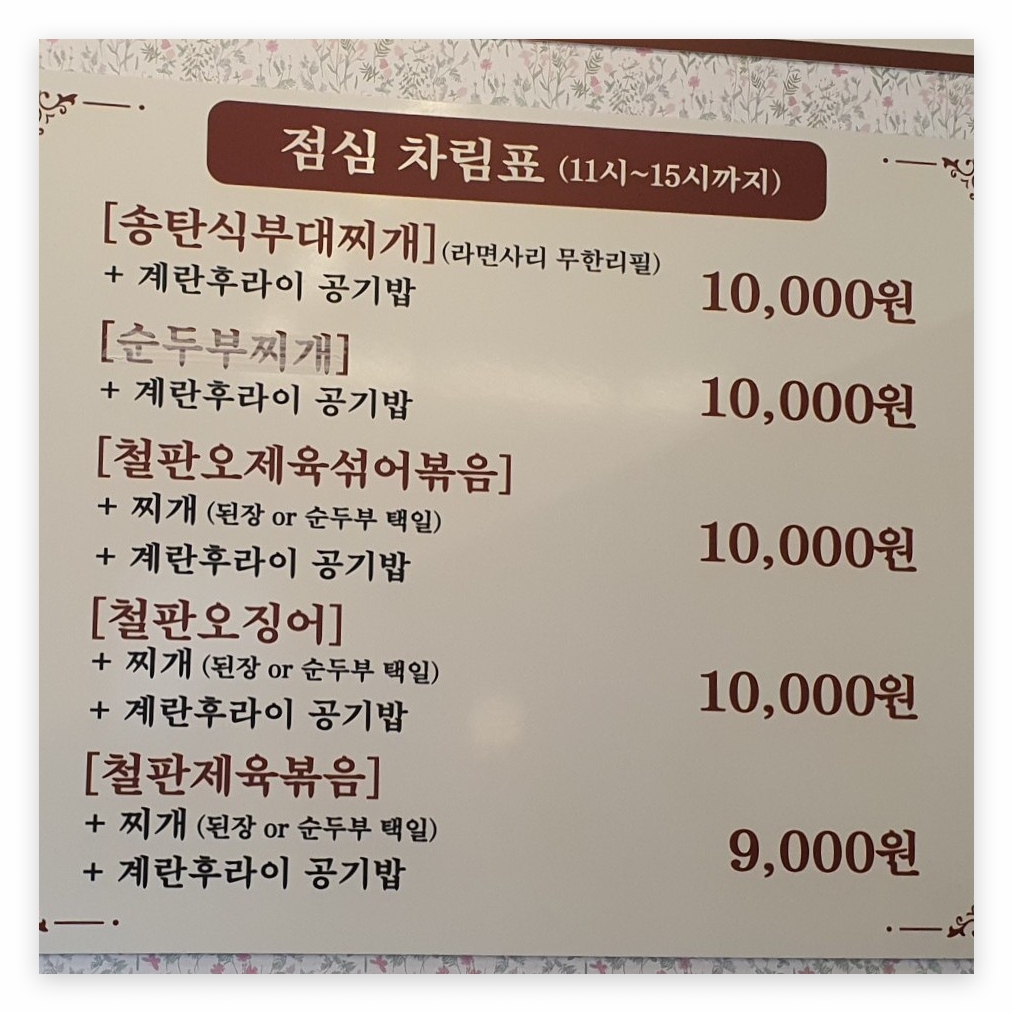 - 순두부찌개 : 10,000원 (계란후라이, 공기밥 포함)