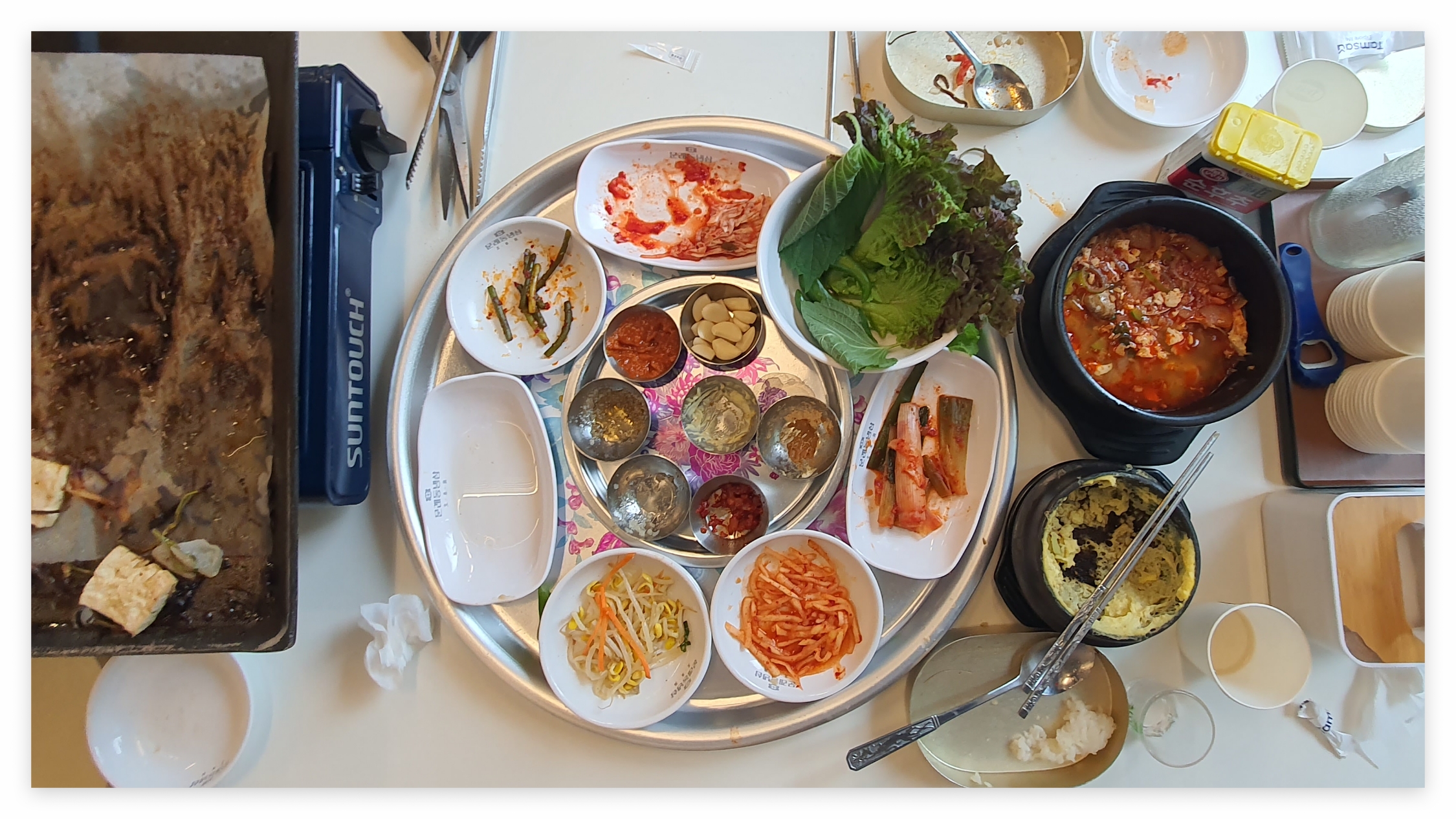 - 밑반찬 5종류: 대파김치, 마늘쫑, 무생채, 옛날소세지, 콩나물무침