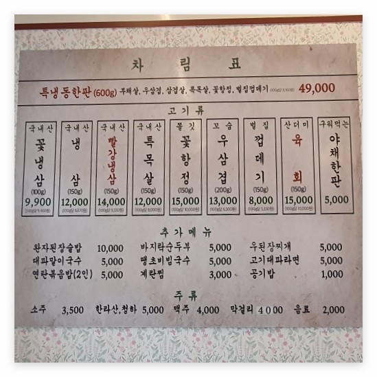 처음에는 점심 메뉴를 고려했지만, 결국 가성비 메뉴인 '특냉동한판(49,000원)'을 선택했습니다. 고물가 시대에 이런 구성은 만나보기 힘들 정도로 가성비가 최고였습니다.