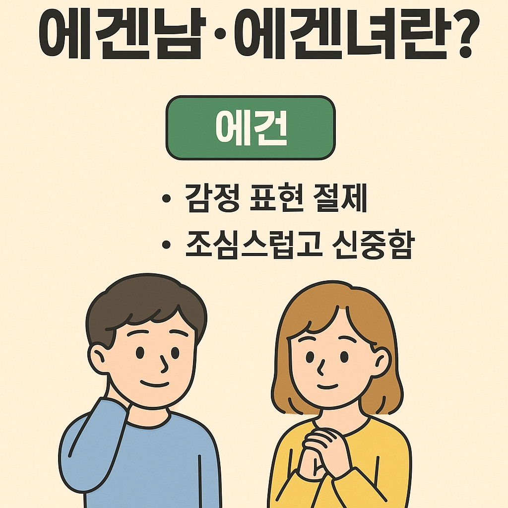 ‘에겐’은 “애정 표현은 ‘겐’지(겸손하게)”에서 유래한 말로, 감정 표현이 절제되고 조심스러운 연애 스타일을 뜻합니다.