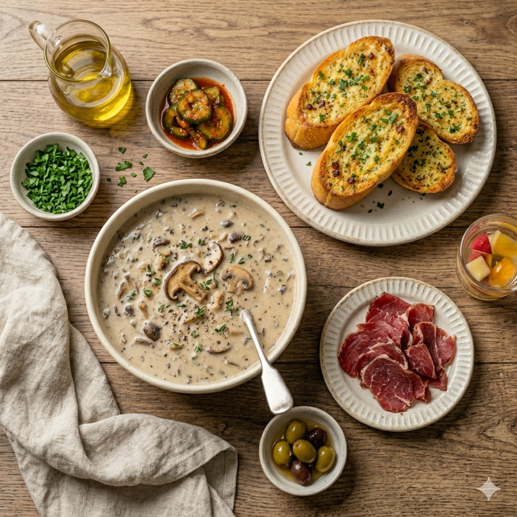 1. 양송이 크림 스프: 바게트를 스프에 찍어 먹는 것은 클래식 중의 클래식입니다.